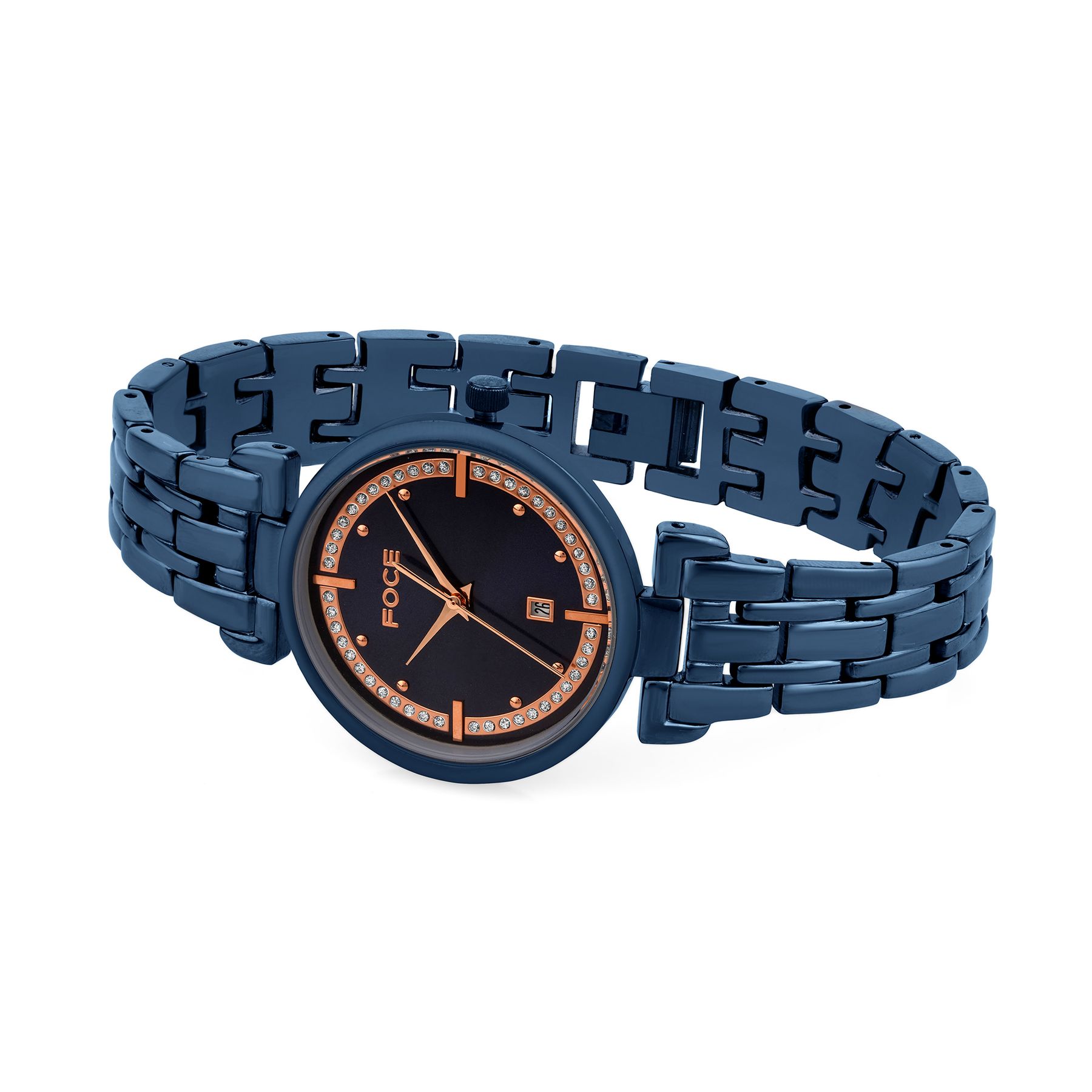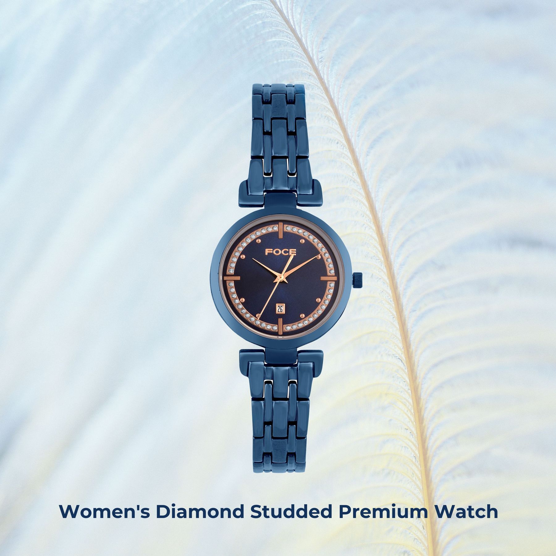 Embrace elegance with the FOCE Diamond-Studded Women’s Watch, featuring a rich dark-blue dial and a shimmering bezel.
