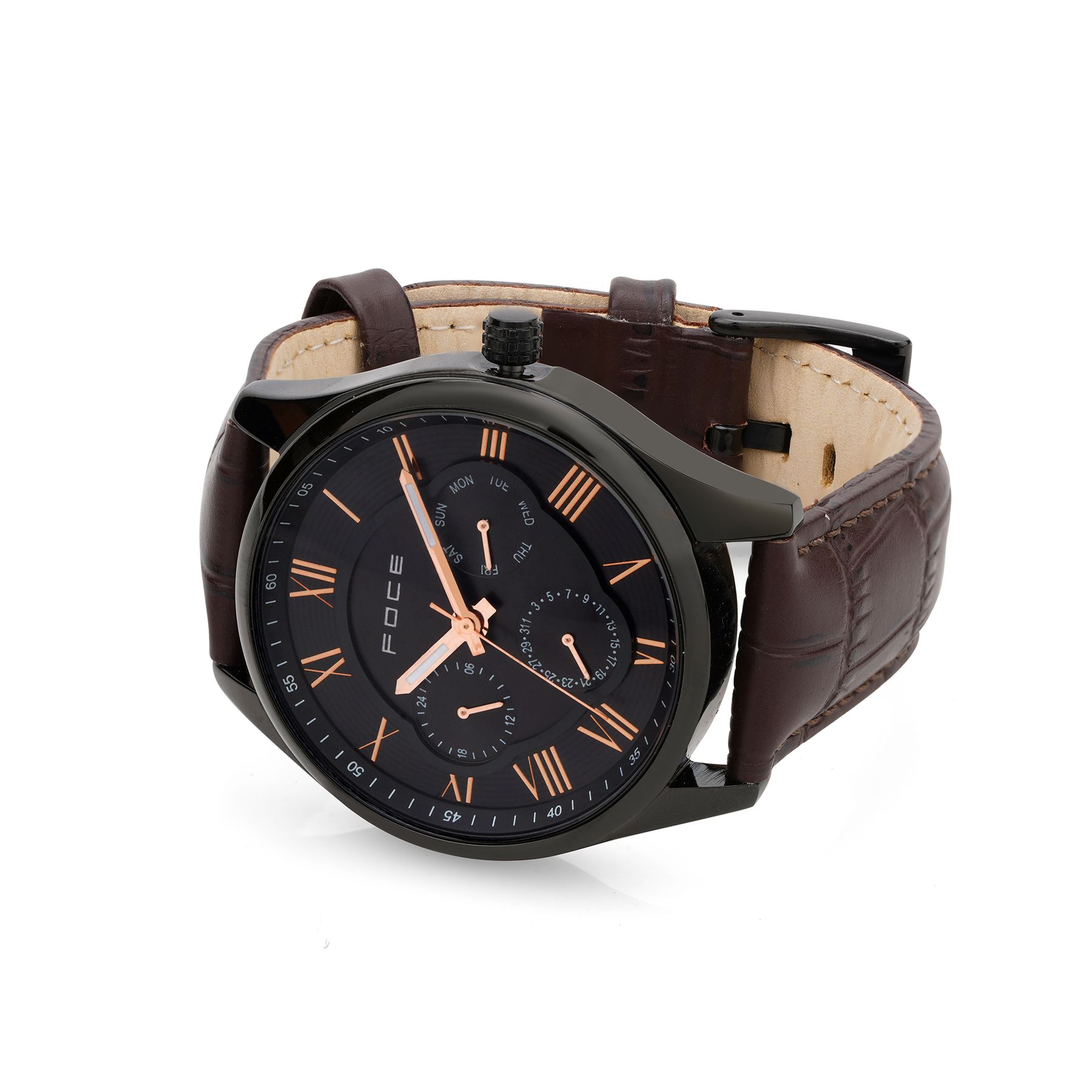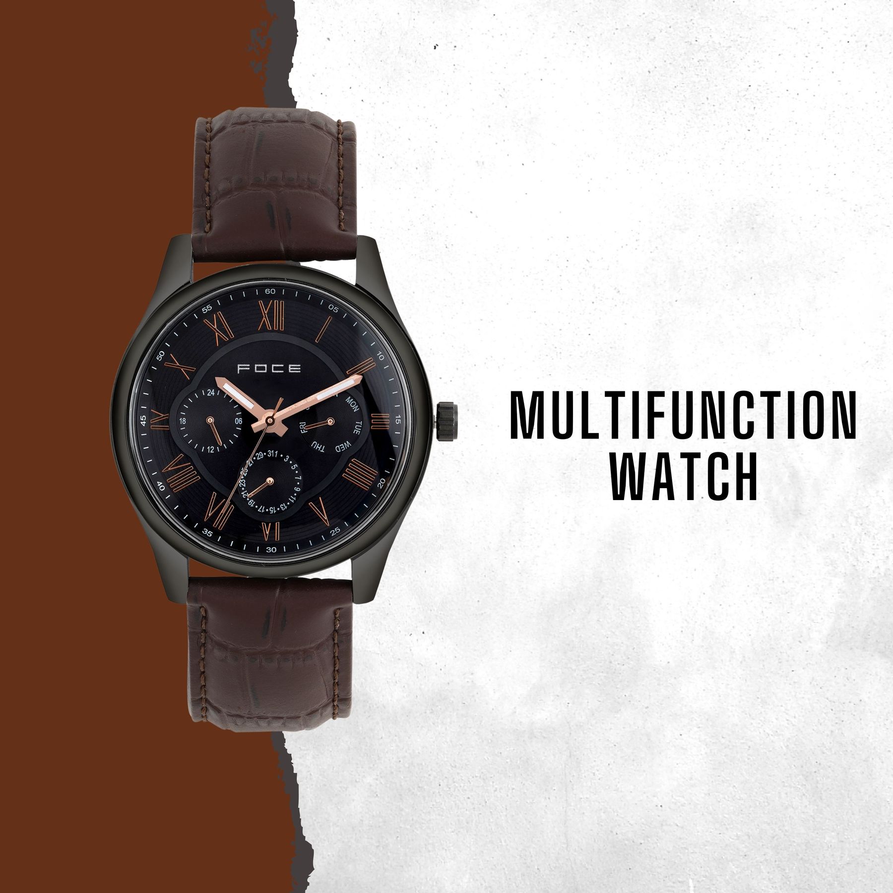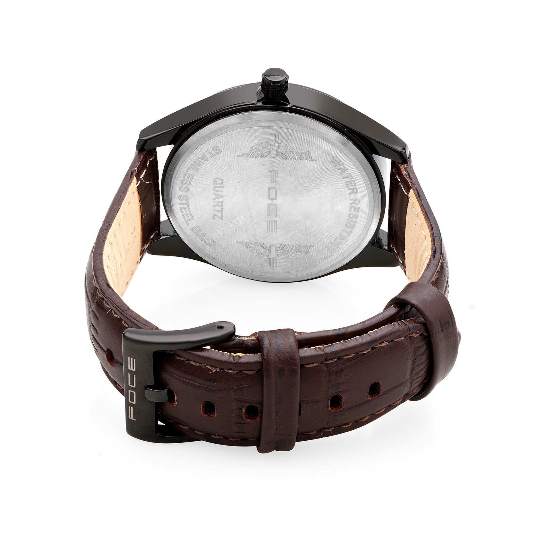 Bold meets refined in the FOCE Men’s Brown Multifunction Watch, featuring a striking black dial, dark brown case, and sleek leather strap.