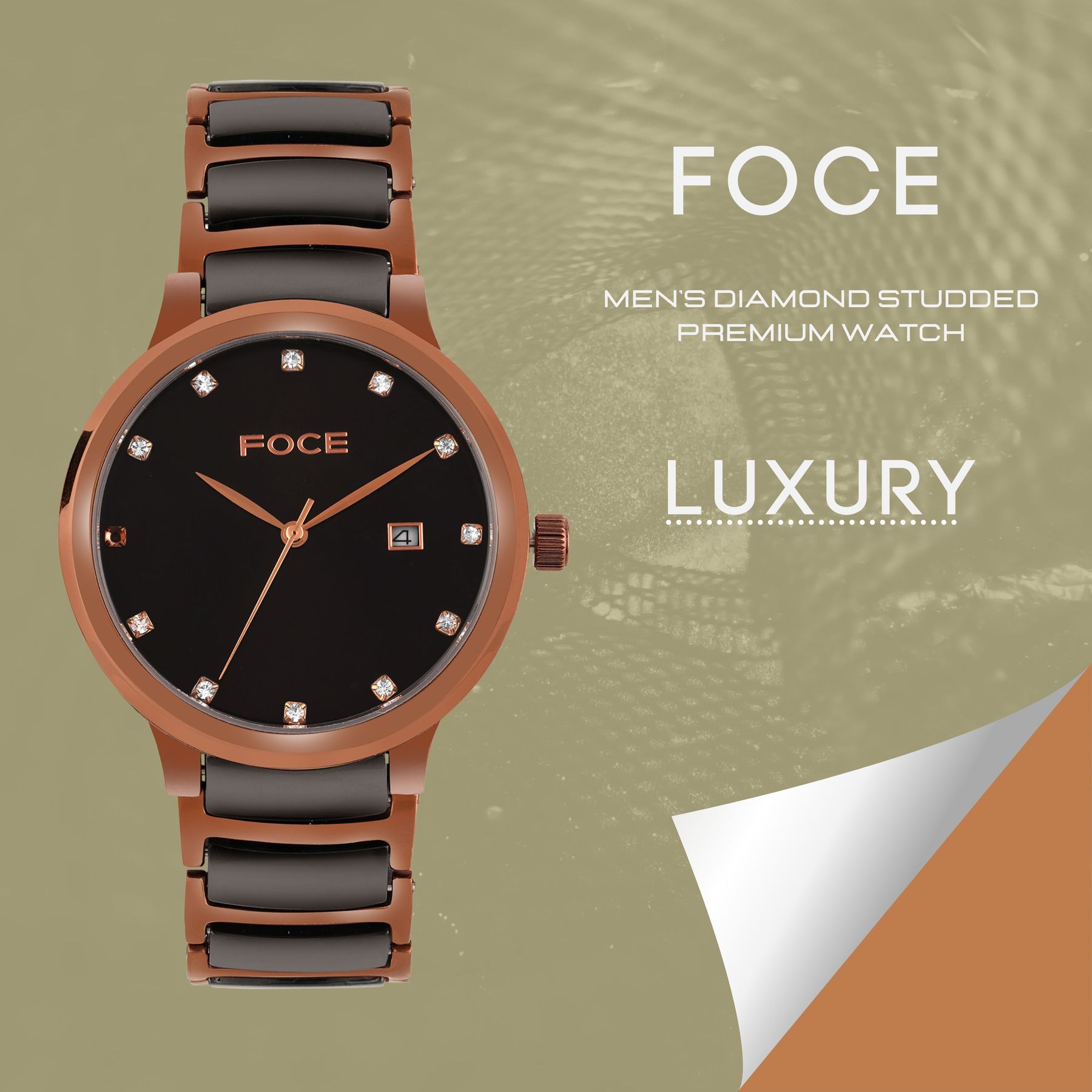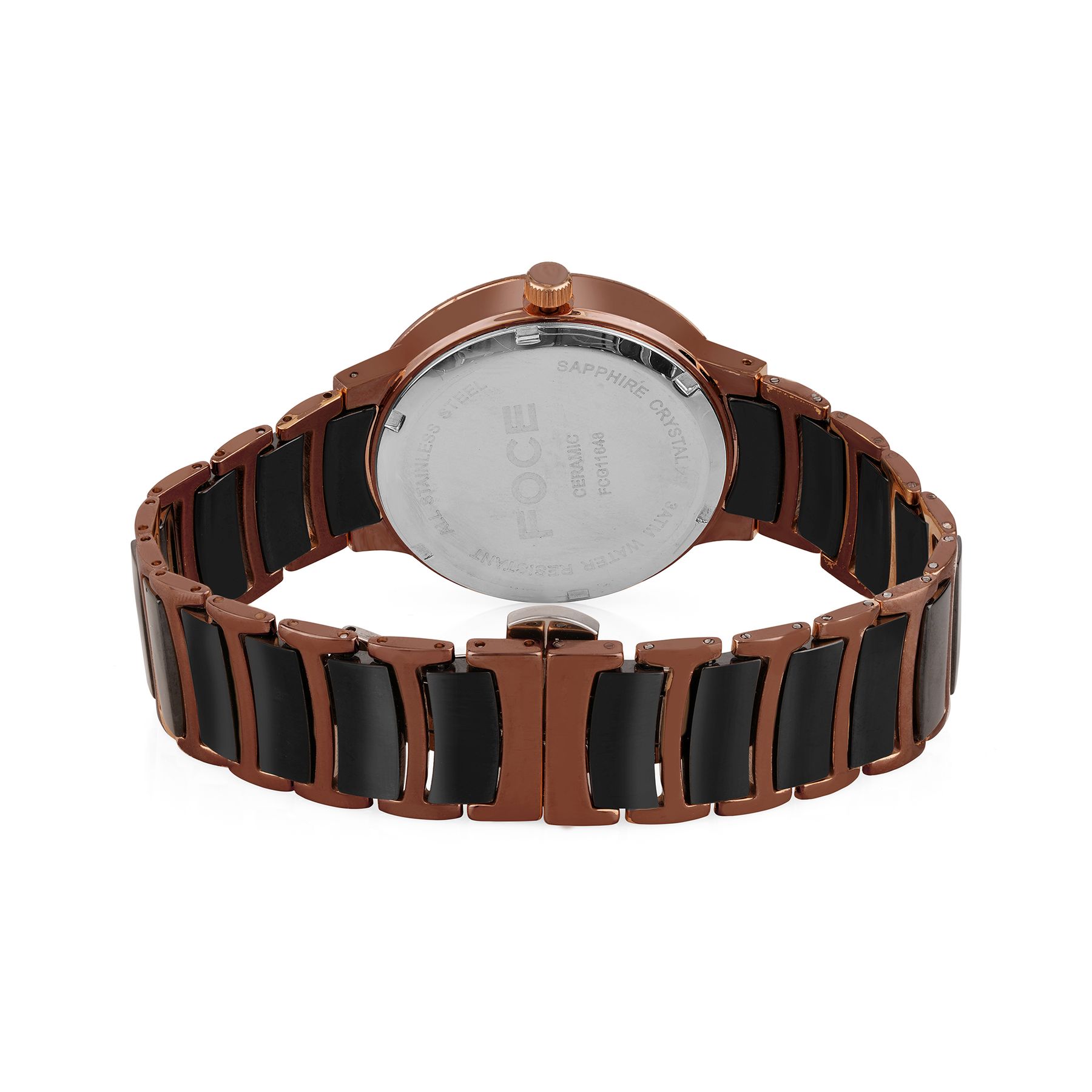 Step into sophistication with FOCE’s Brown Diamond-Studded Men’s Watch, crafted with a lustrous dual-tone metal and ceramic strap.