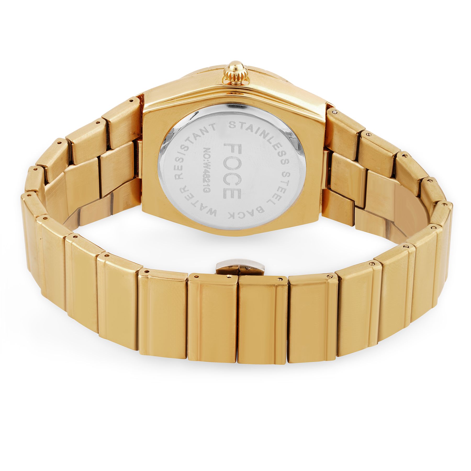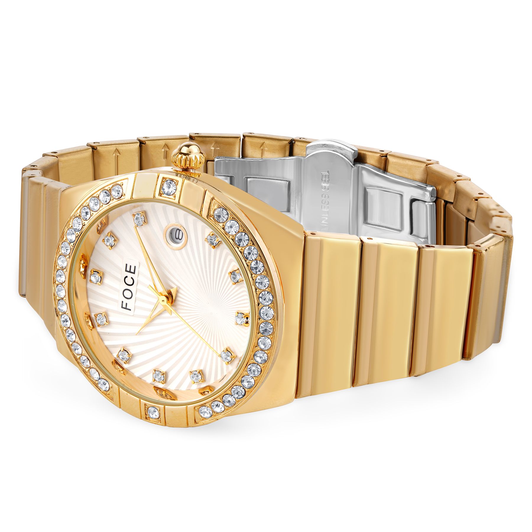 Make a bold impression with the FOCE Men’s Golden Analog Watch, featuring a white dial, diamond-studded bezel, and matching golden stainless steel strap.