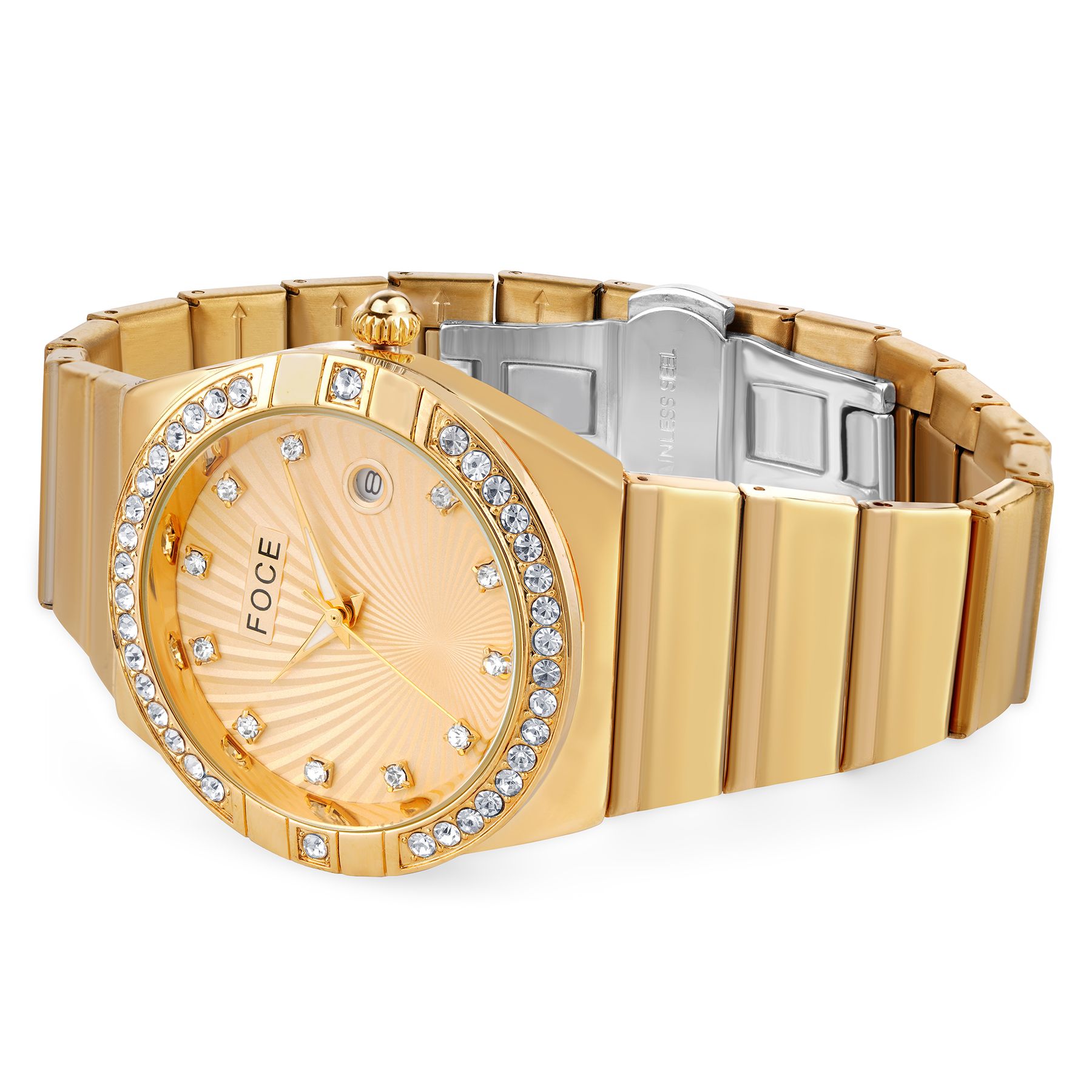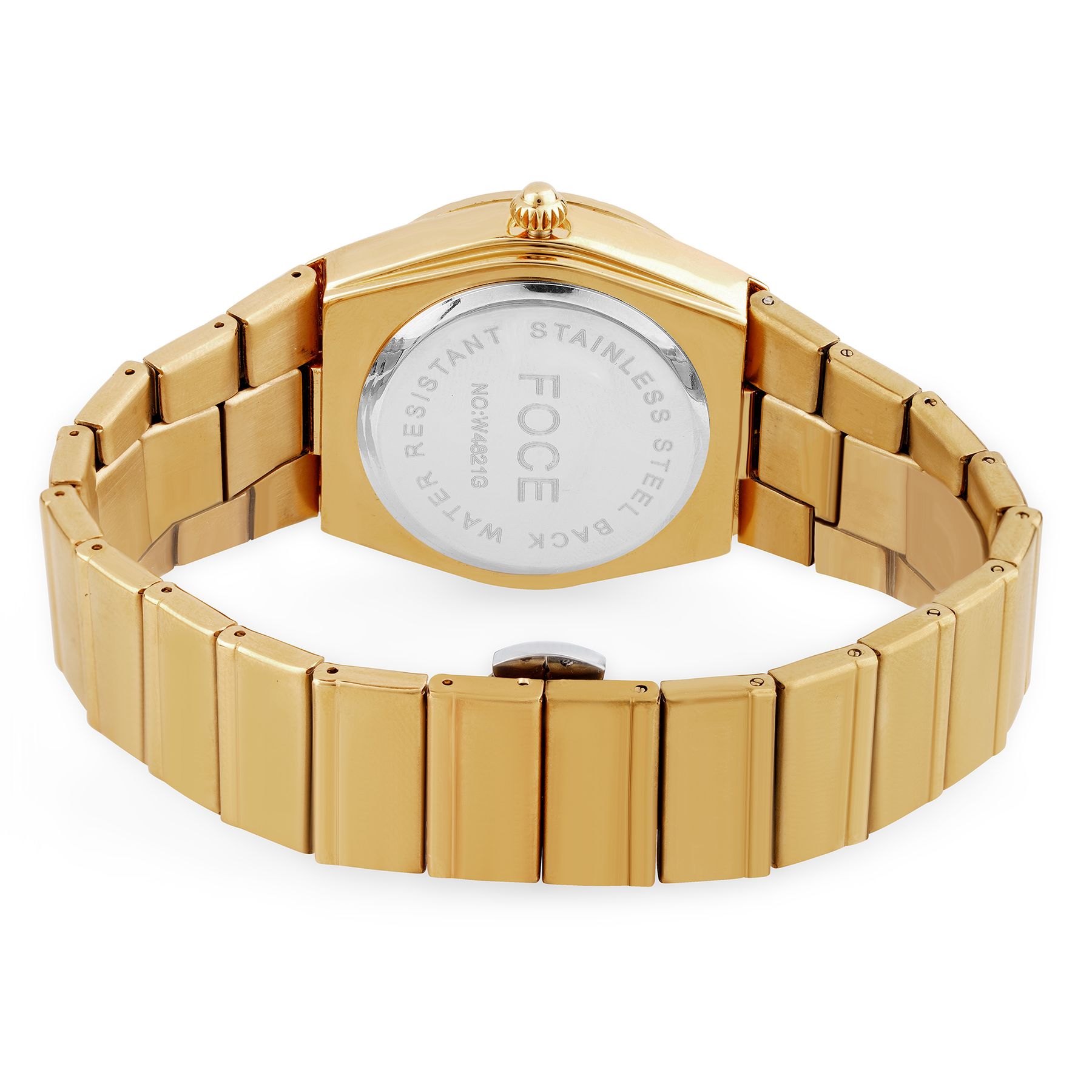 Make a bold impression with the FOCE Men’s Golden Analog Watch, featuring a golden dial, diamond-studded bezel, and matching golden stainless steel strap.
