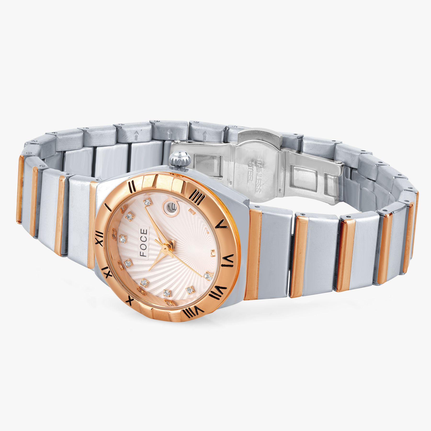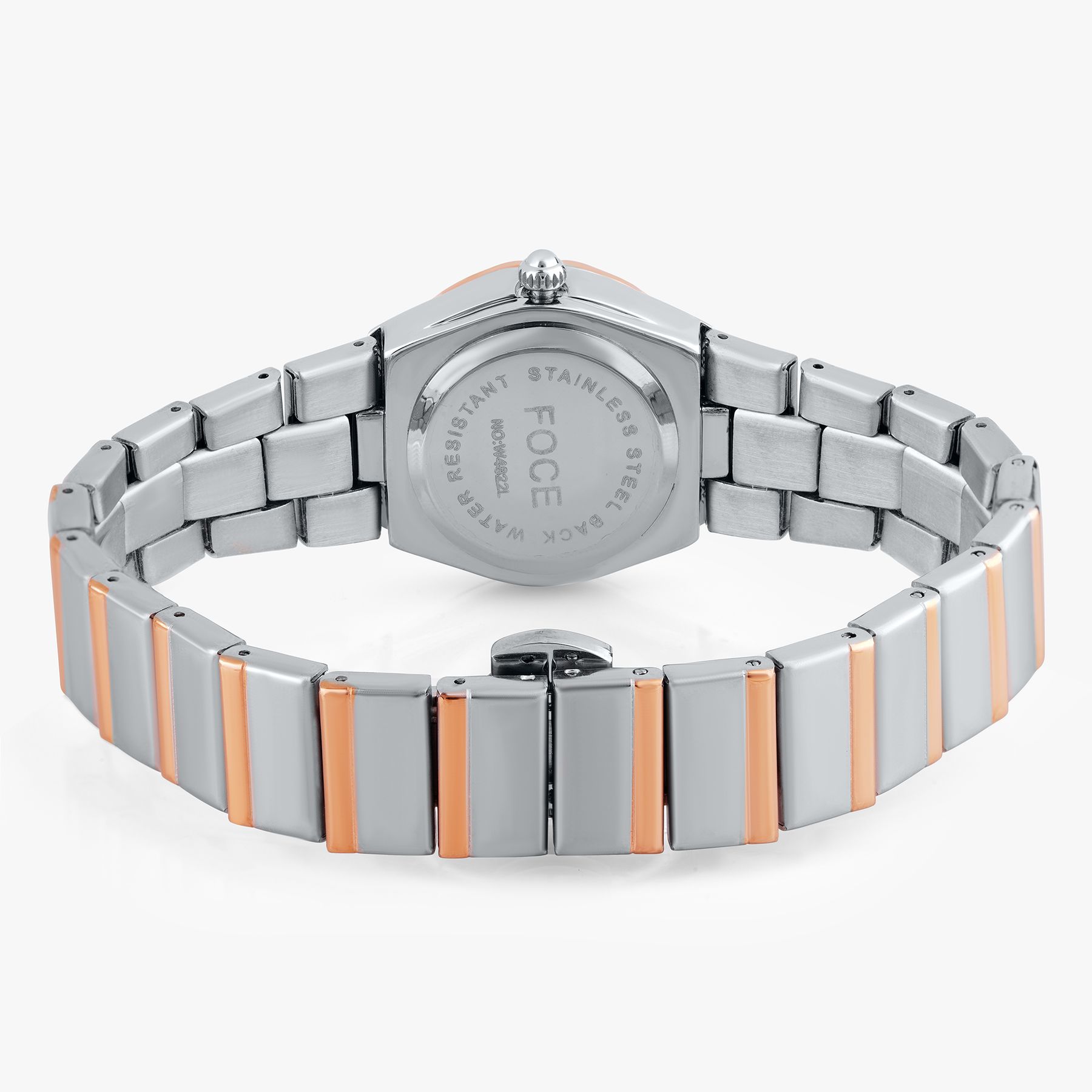 Radiate elegance with the FOCE Women’s Two Tone Silver/Rose Gold Analog Watch, showcasing a diamond-studded white dial, Roman numeral bezel, and a graceful golden stainless steel strap.