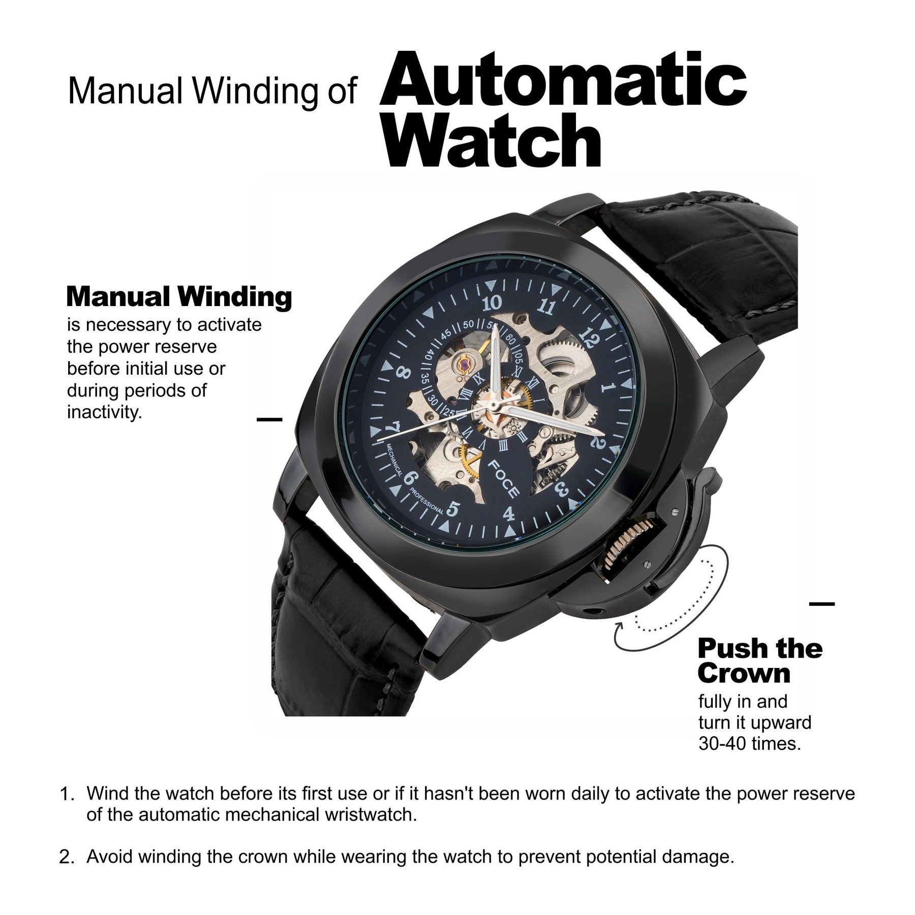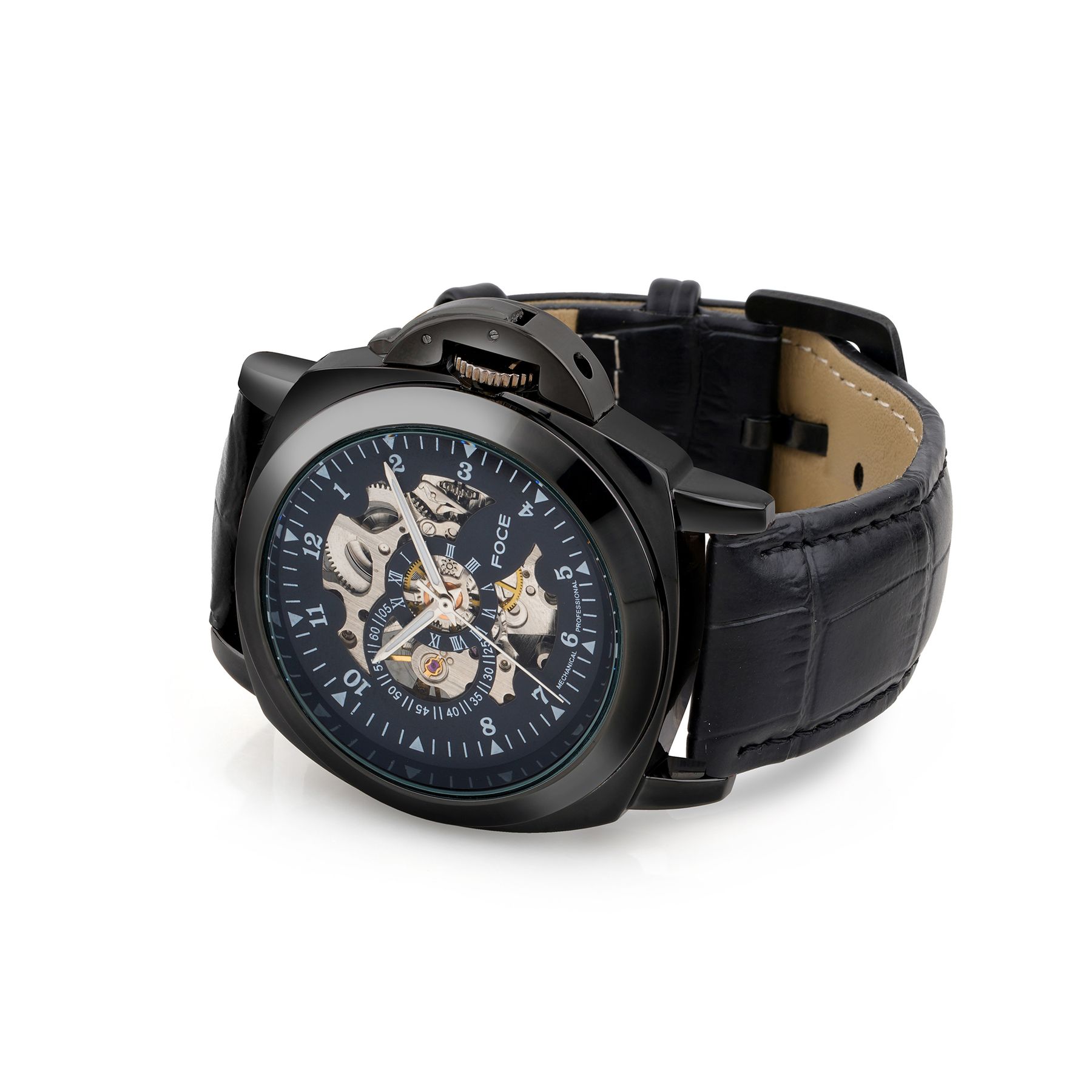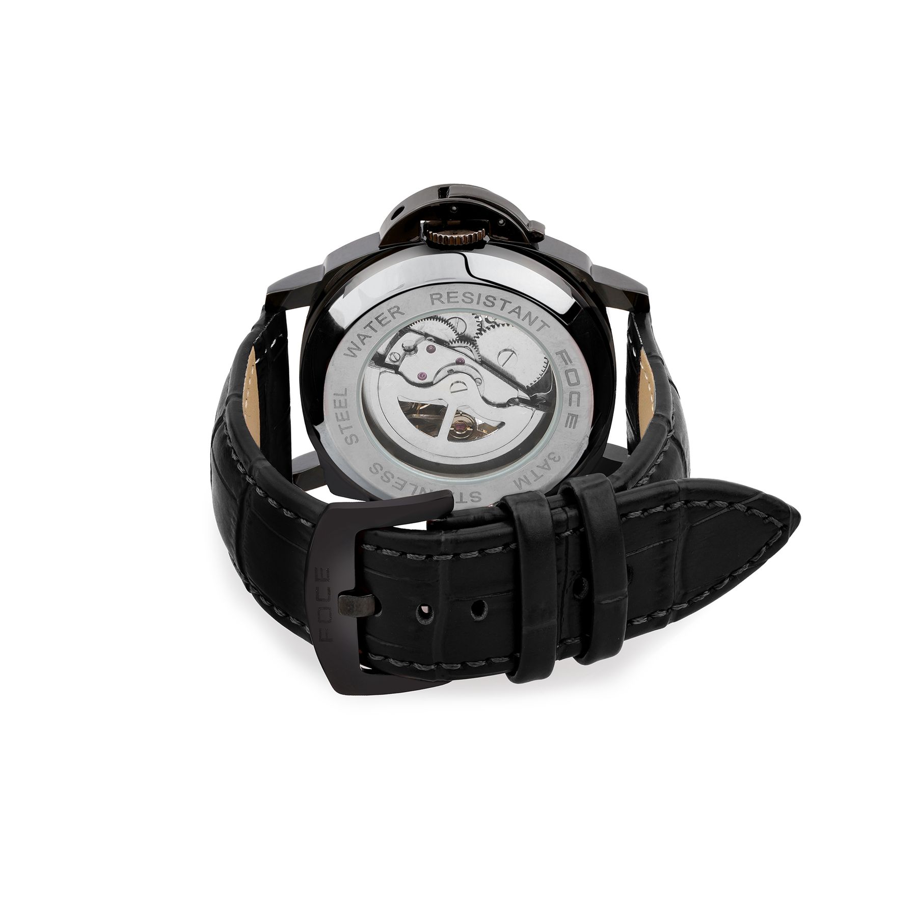 Elevate your style with the FOCE Men’s Black Automatic Watch, featuring a stunning white skeleton dial, glass back, and rich black leather strap.
