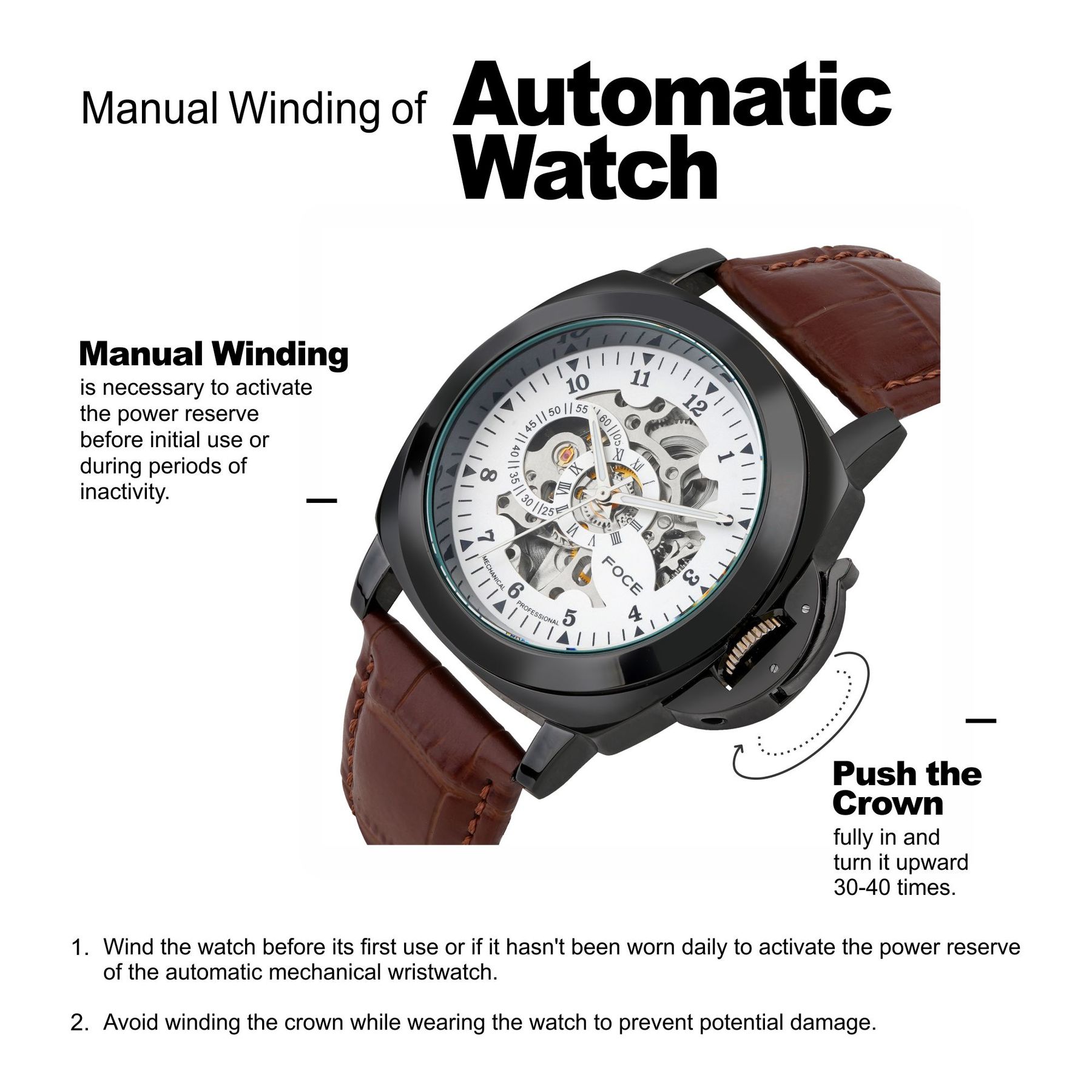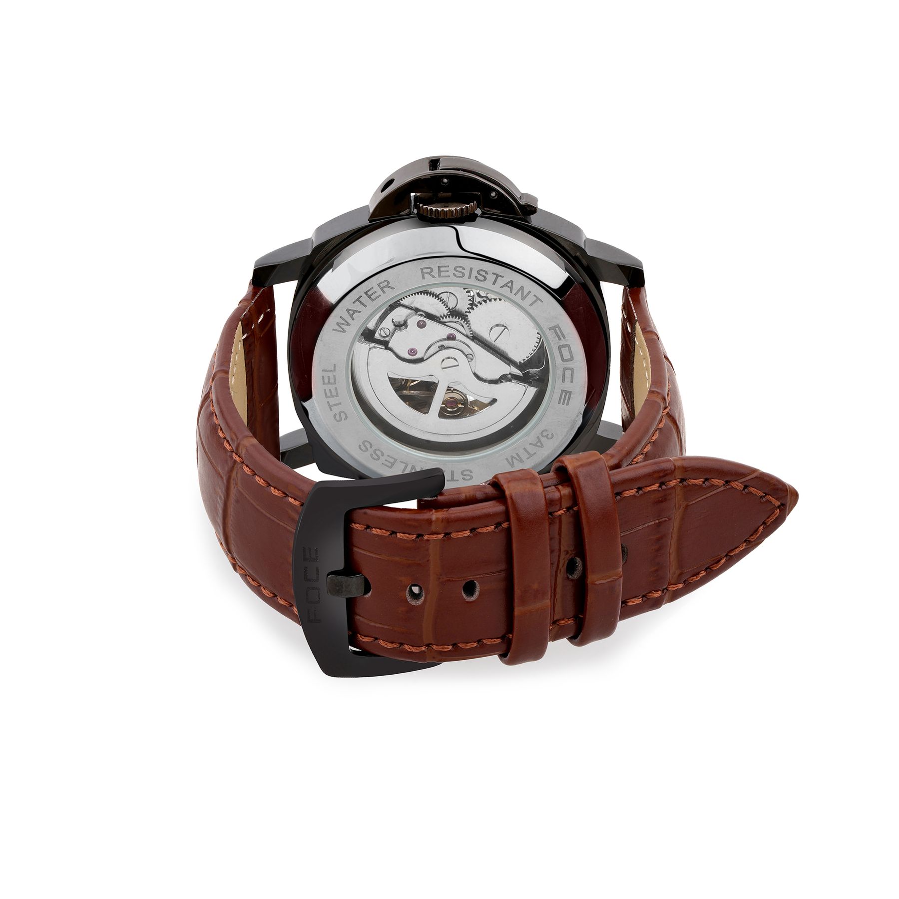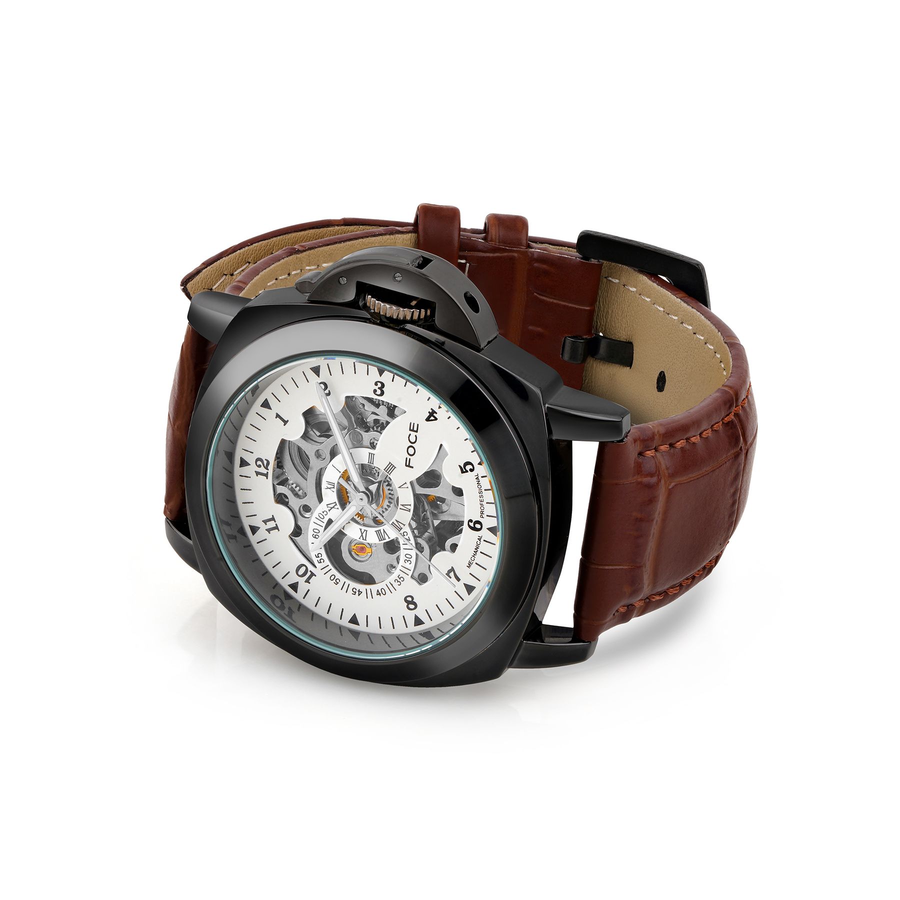 Elevate your style with the FOCE Men’s Black Automatic Watch, featuring a stunning white skeleton dial, glass back, and rich brown leather strap.