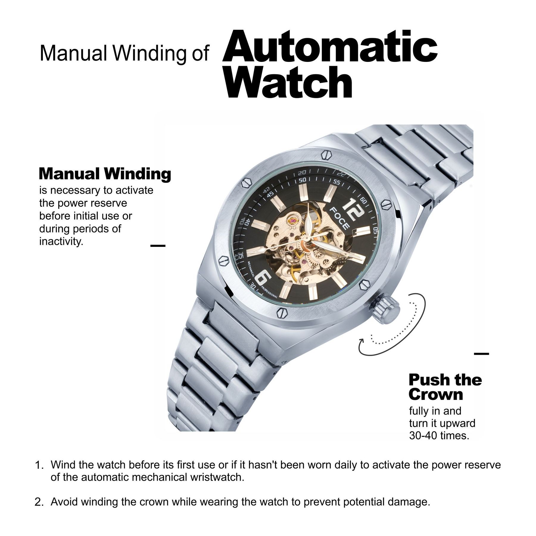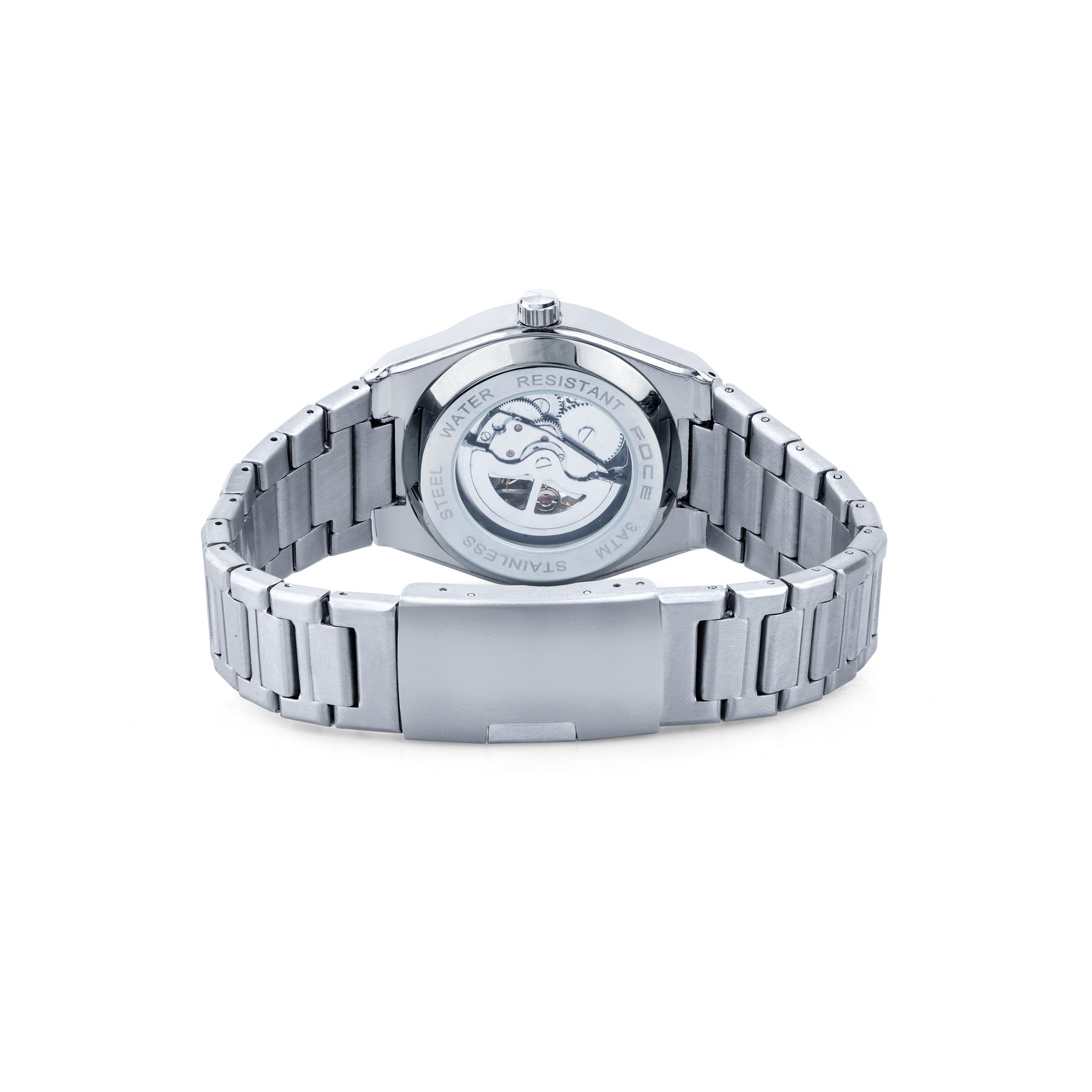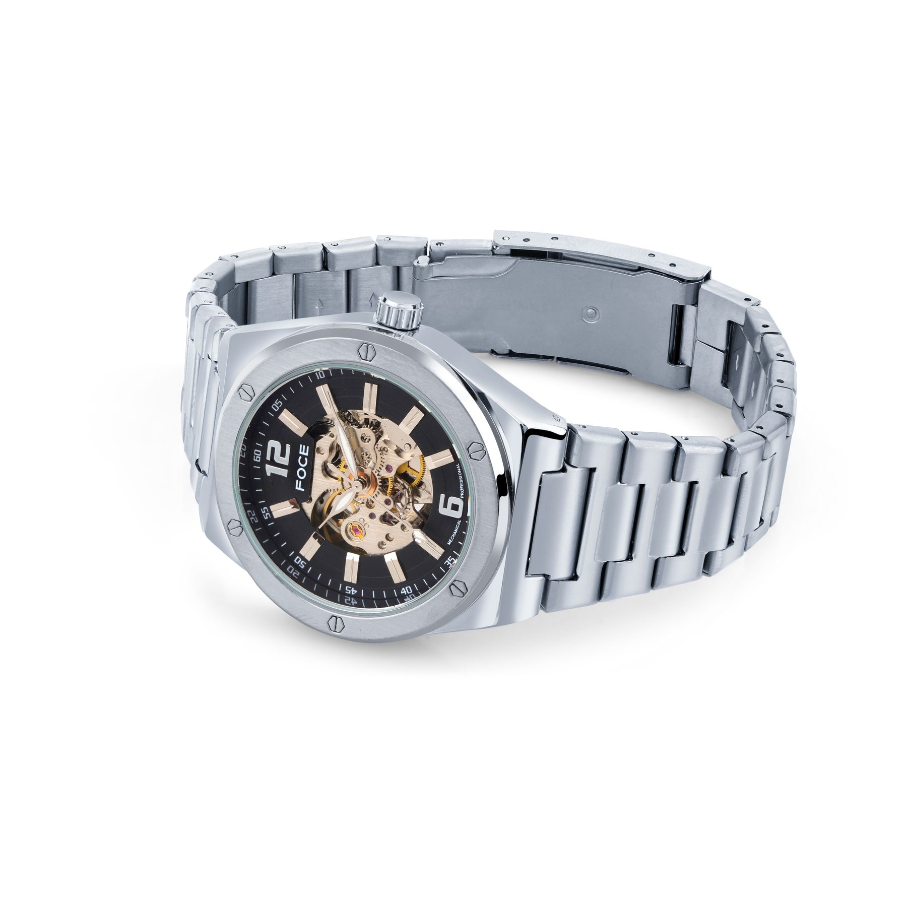 Discover refined sophistication with FOCE’s Silver Automatic Wristwatch, powered by advanced self-winding movement—no battery required. Its striking black skeleton dial and transparent glass back reveal the intricate mechanics in motion, blending modern precision with timeless watchmaking tradition. Crafted in durable stainless steel with a robust strap, this versatile timepiece embodies elegance, durability, and prestige for every occasion.