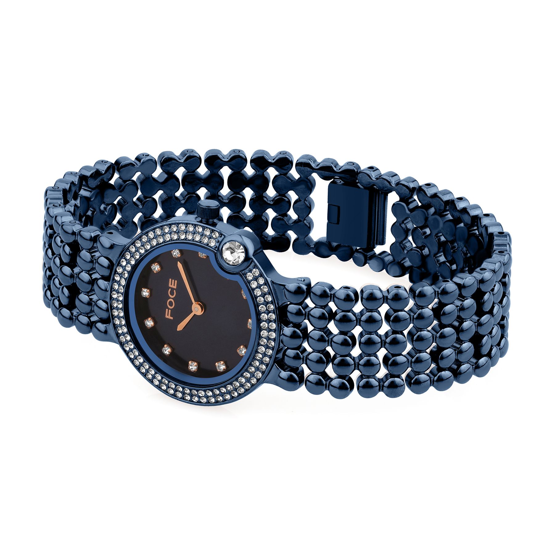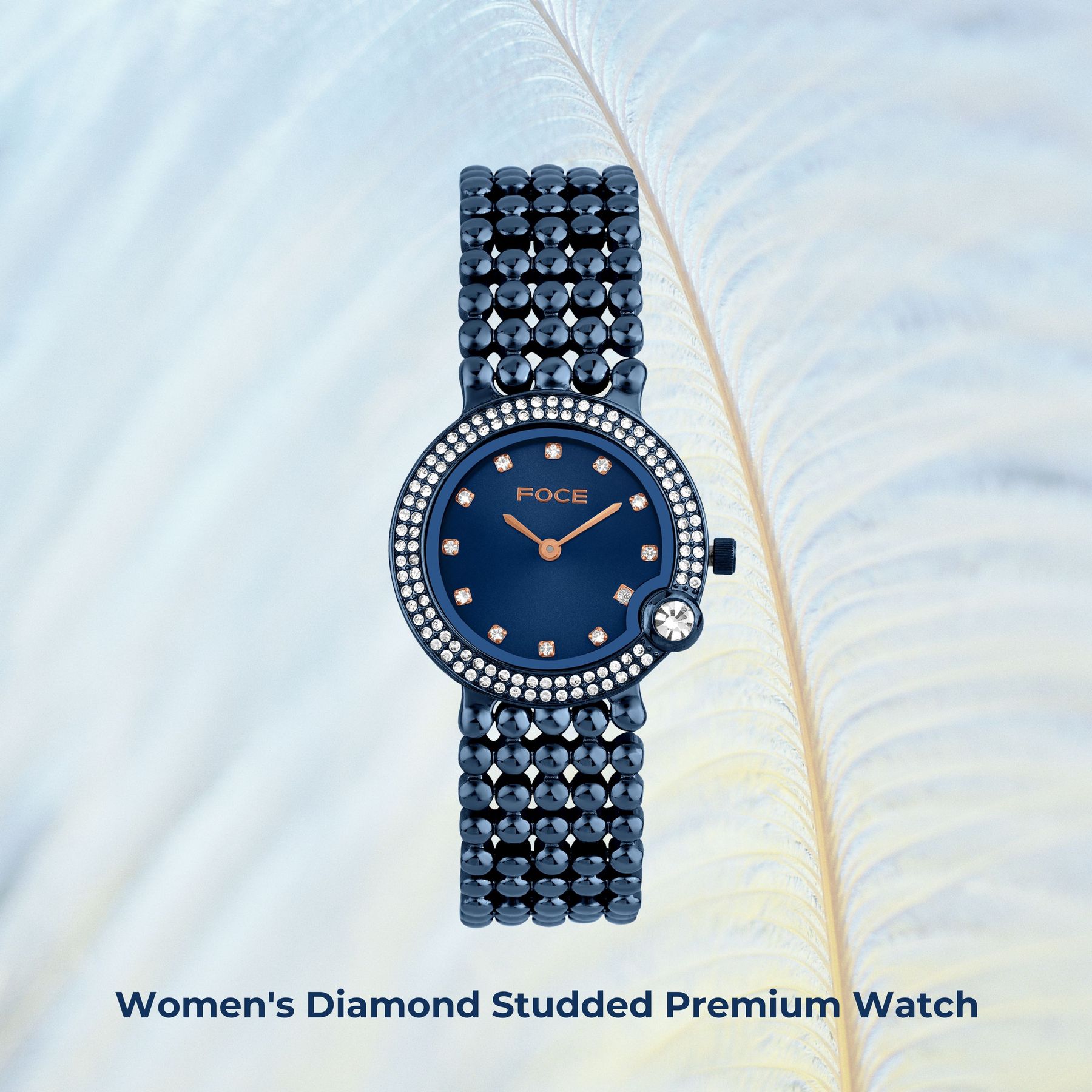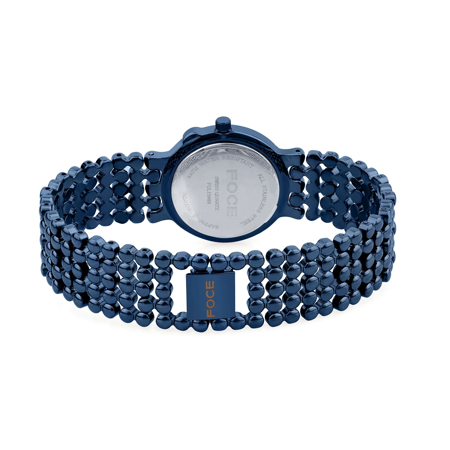 Experience sapphire elegance with this FOCE women’s watch, where diamond detailing meets a rich blue metallic finish.
