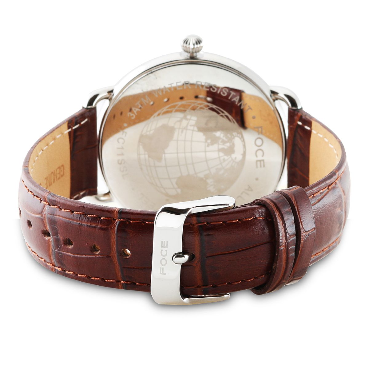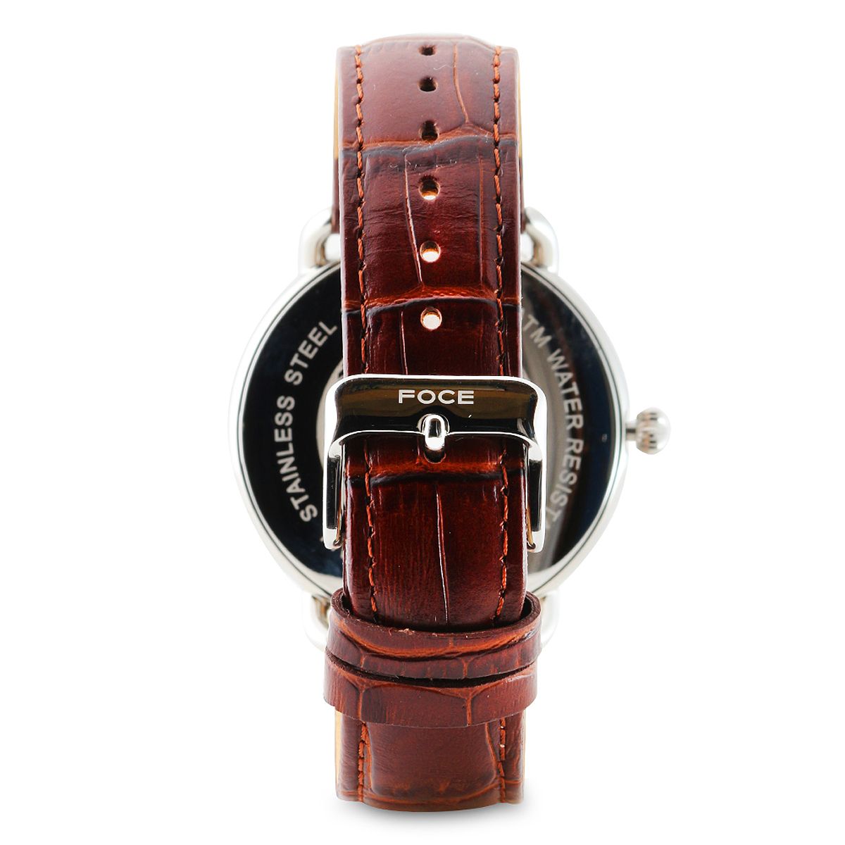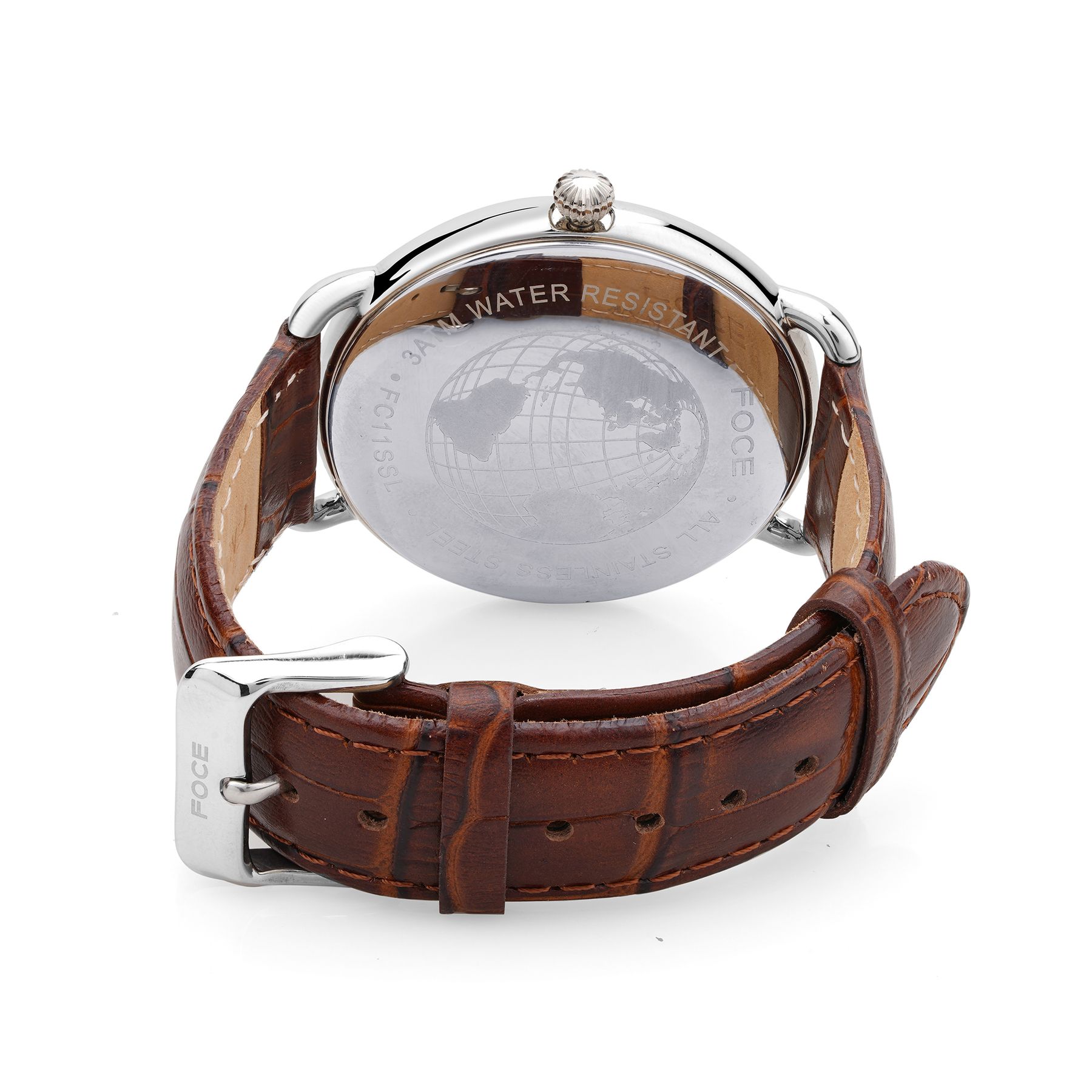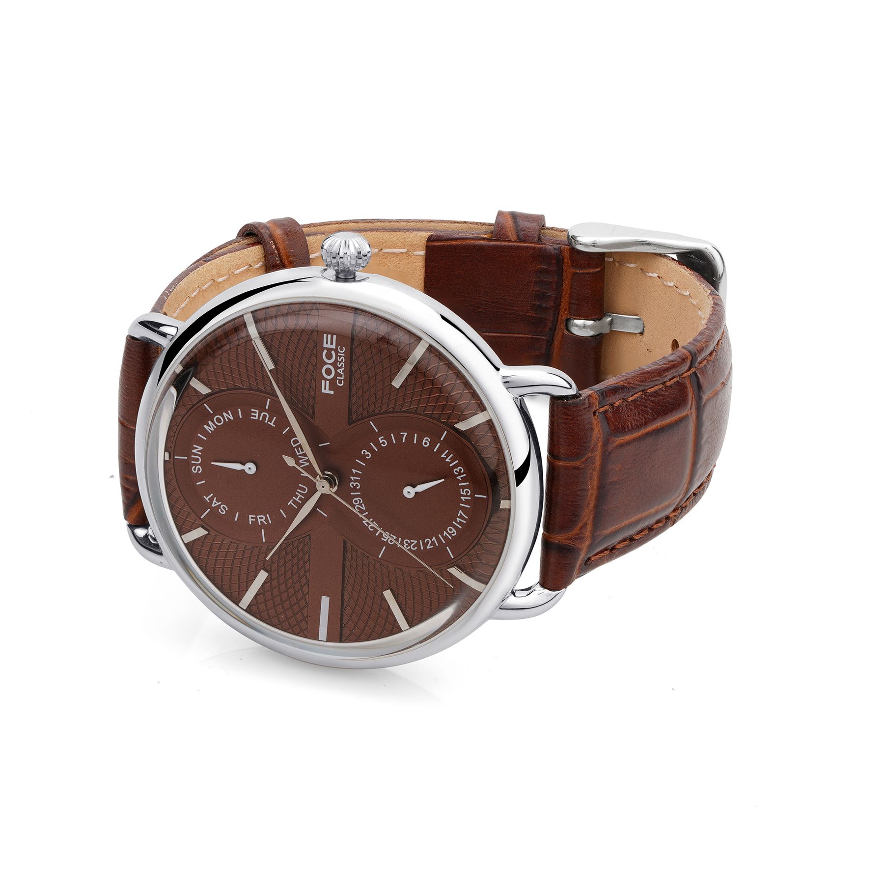 Command attention with the FOCE Brown Multifunction Watch, featuring a striking black dial with bold white numerals, curved dome glass, and day/date windows. Completed with a rich brown leather strap and gunmetal-plated stainless steel case, it’s the perfect combination of heritage, precision, and modern elegance.