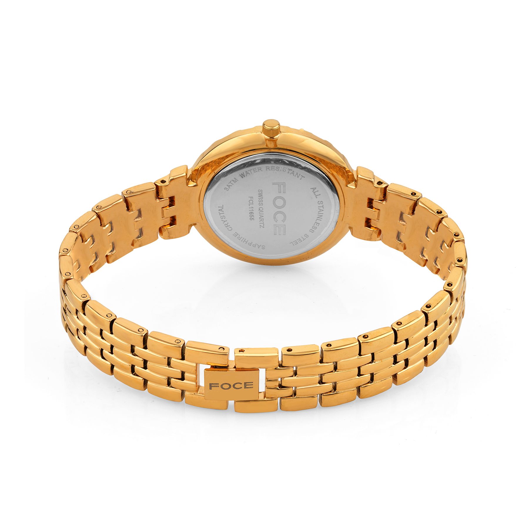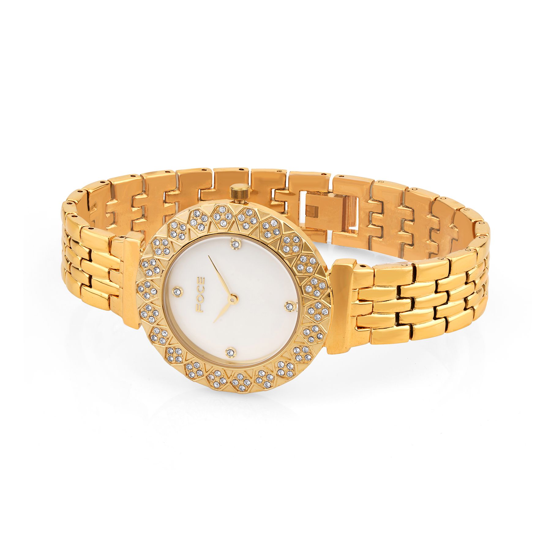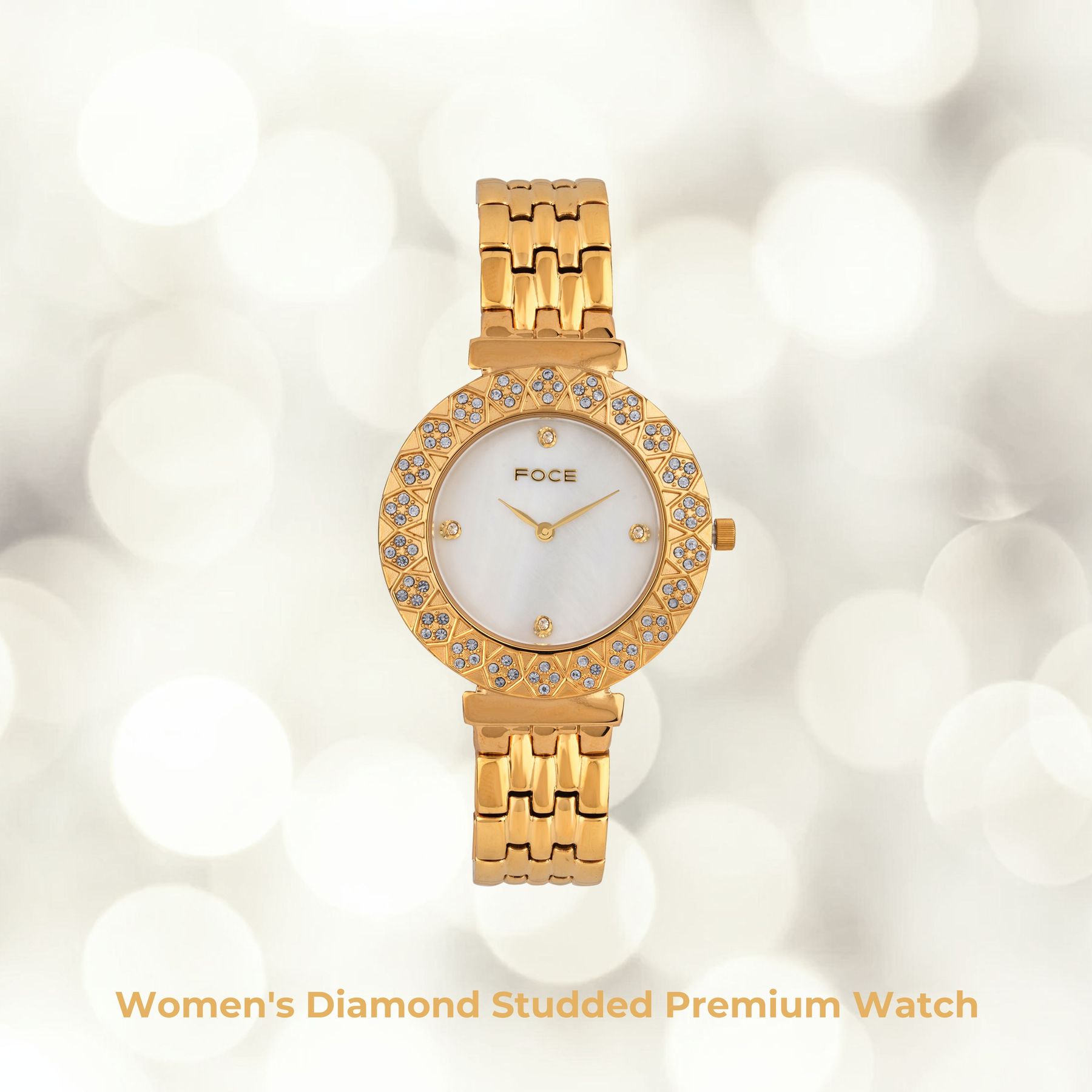 Experience refined glamour with FOCE’s Diamond-Studded Golden Wrist Watch for Women, crafted with a radiant white dial and sapphire glass.