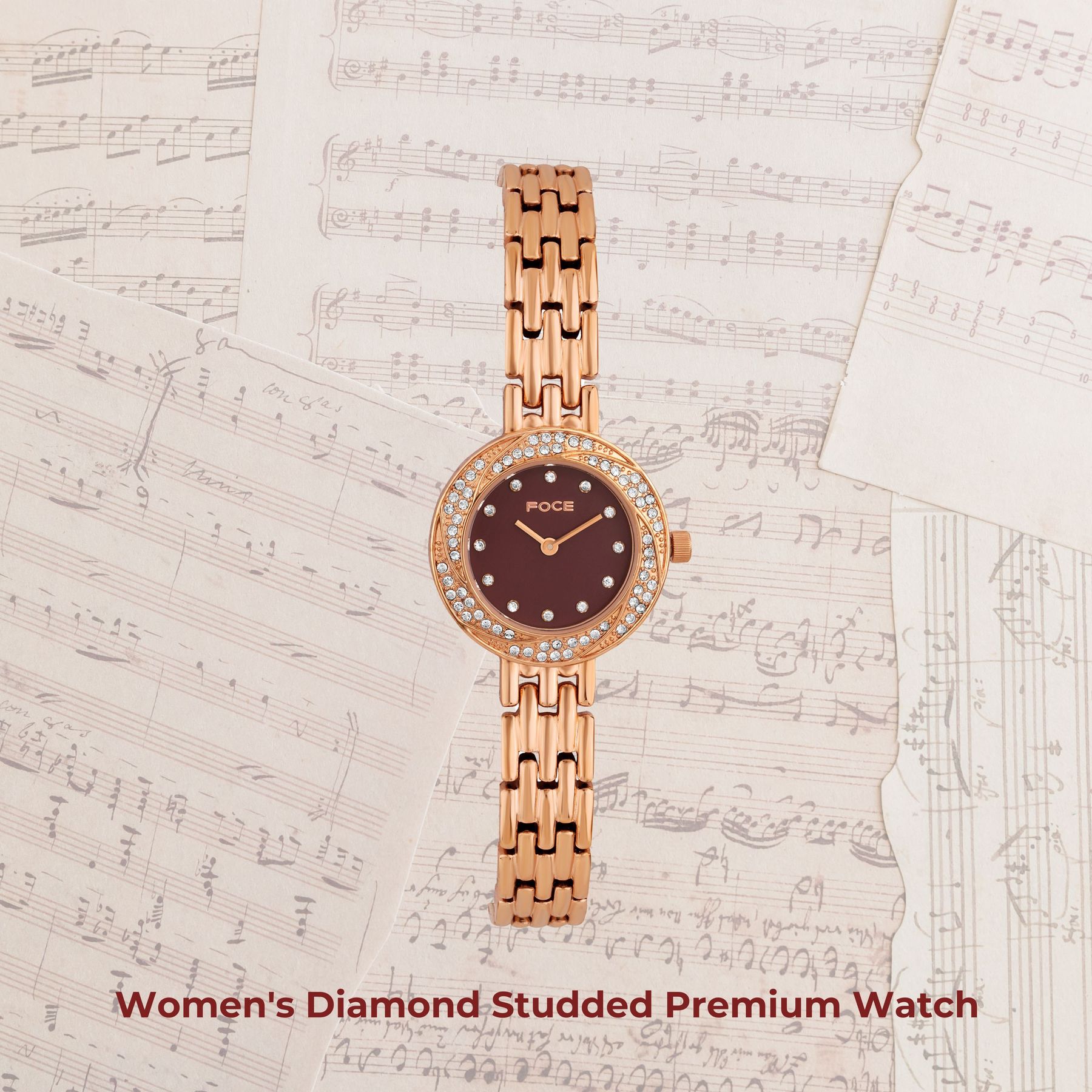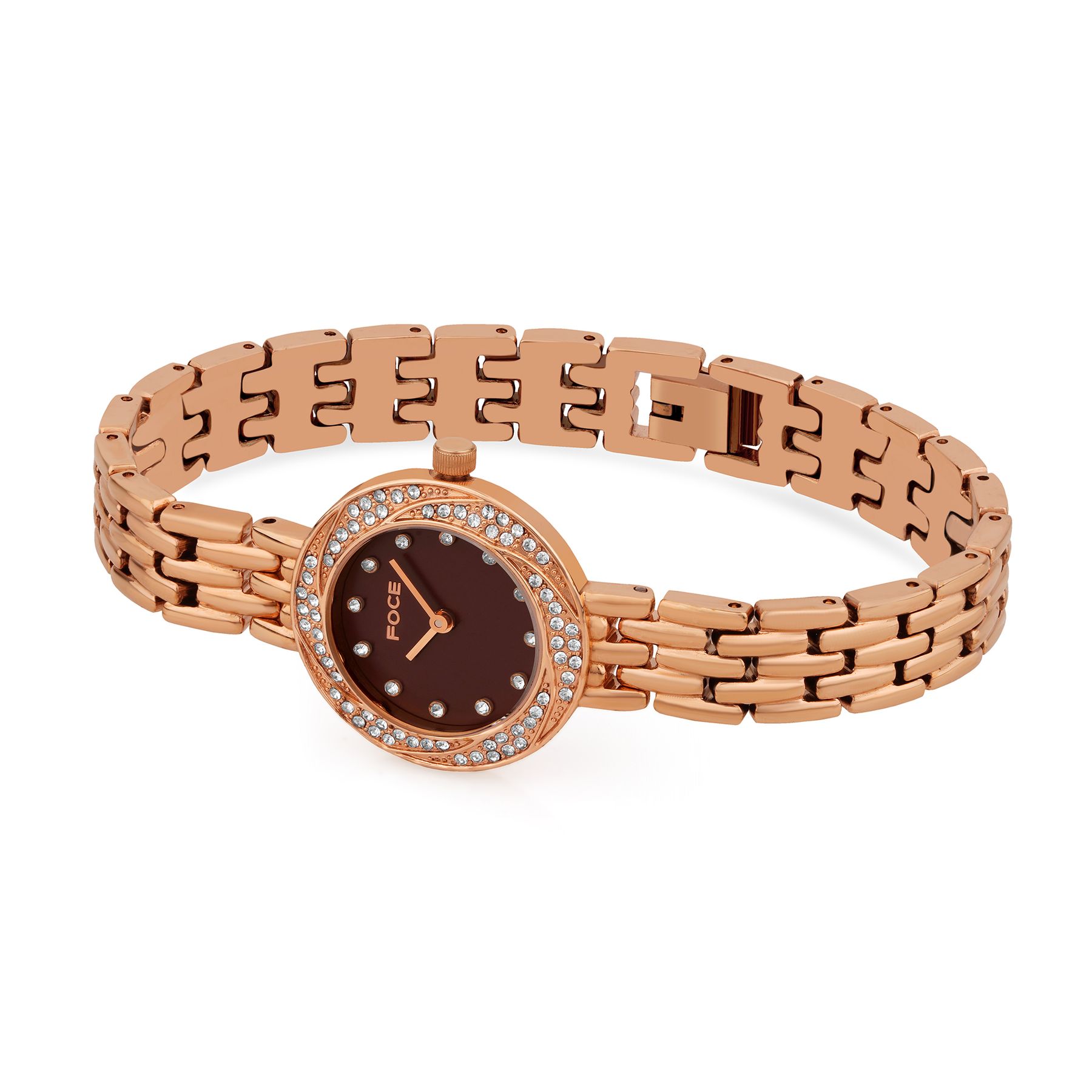 Elevate your look with FOCE’s Diamond-Studded Women’s Watch, featuring a deep brown dial and gleaming round case.