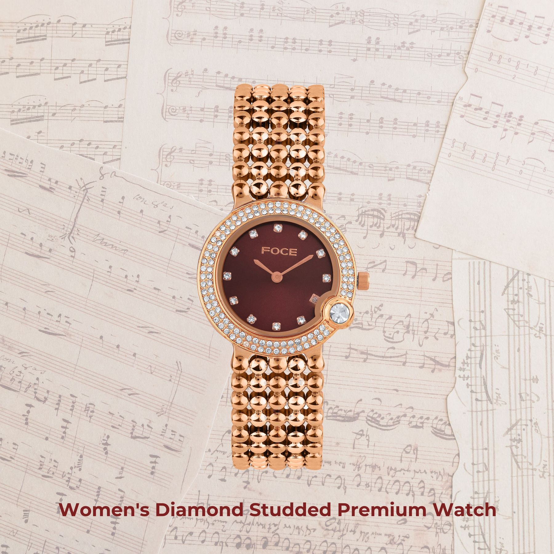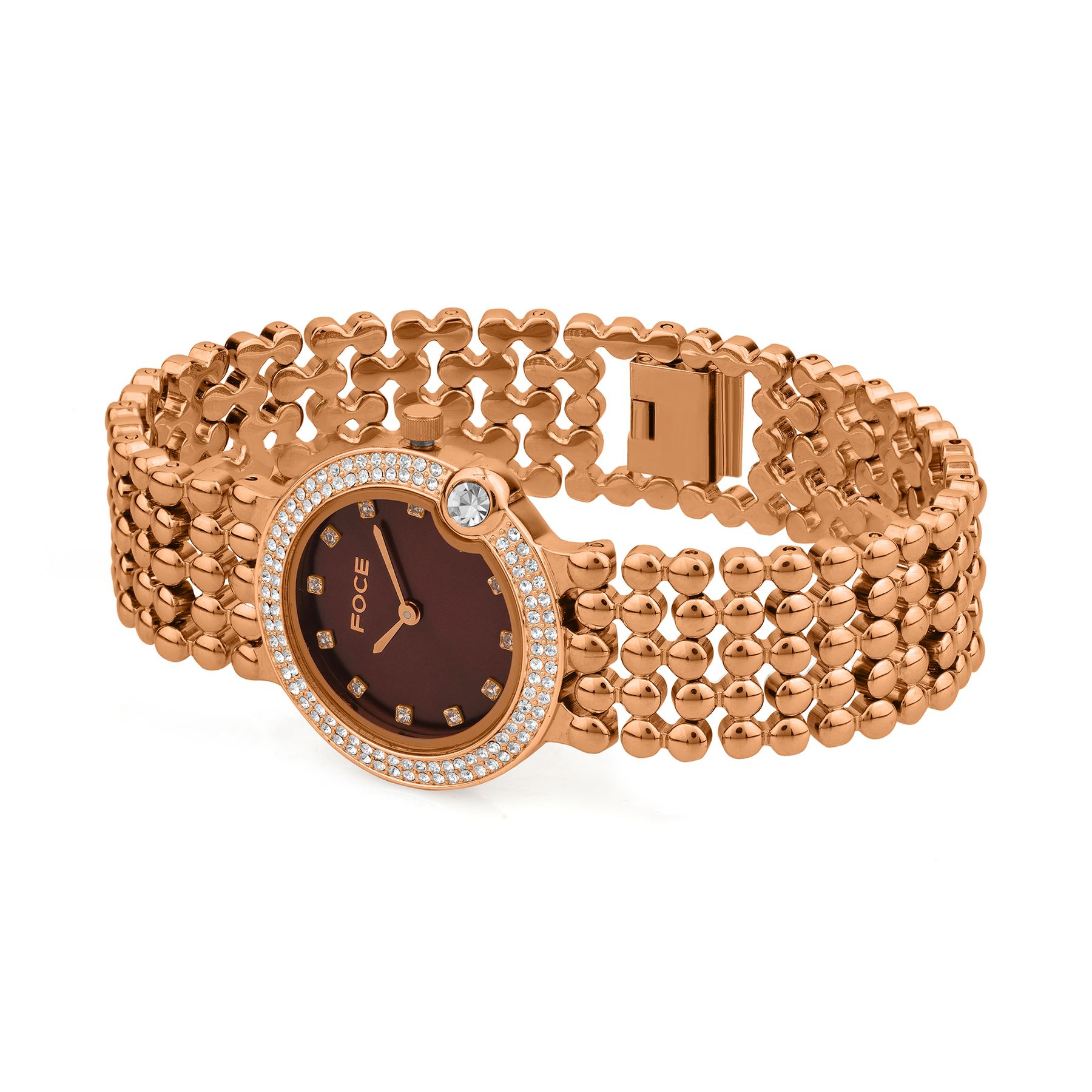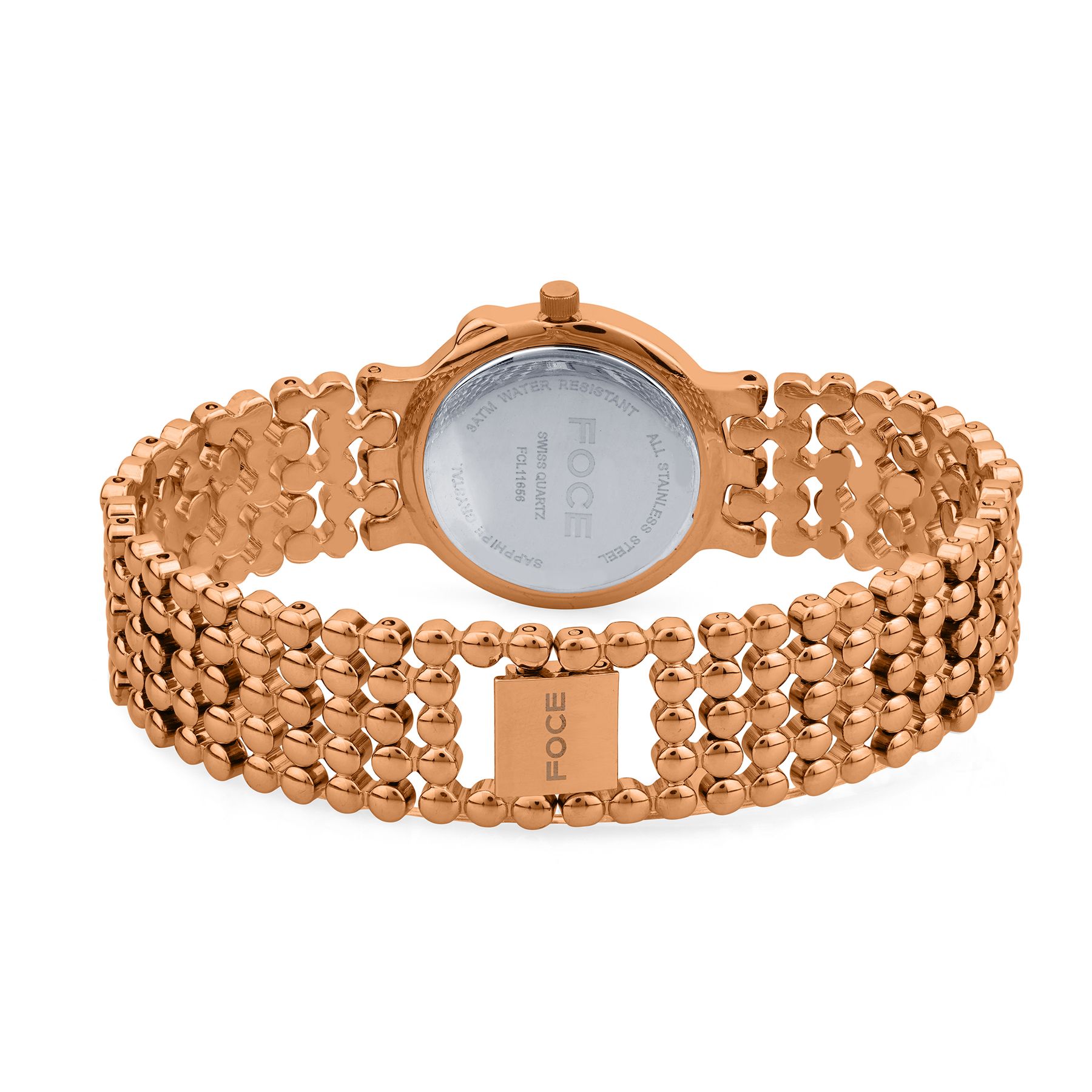 Experience sapphire elegance with this FOCE women’s watch, where diamond detailing meets a rich rose gold metallic finish.
