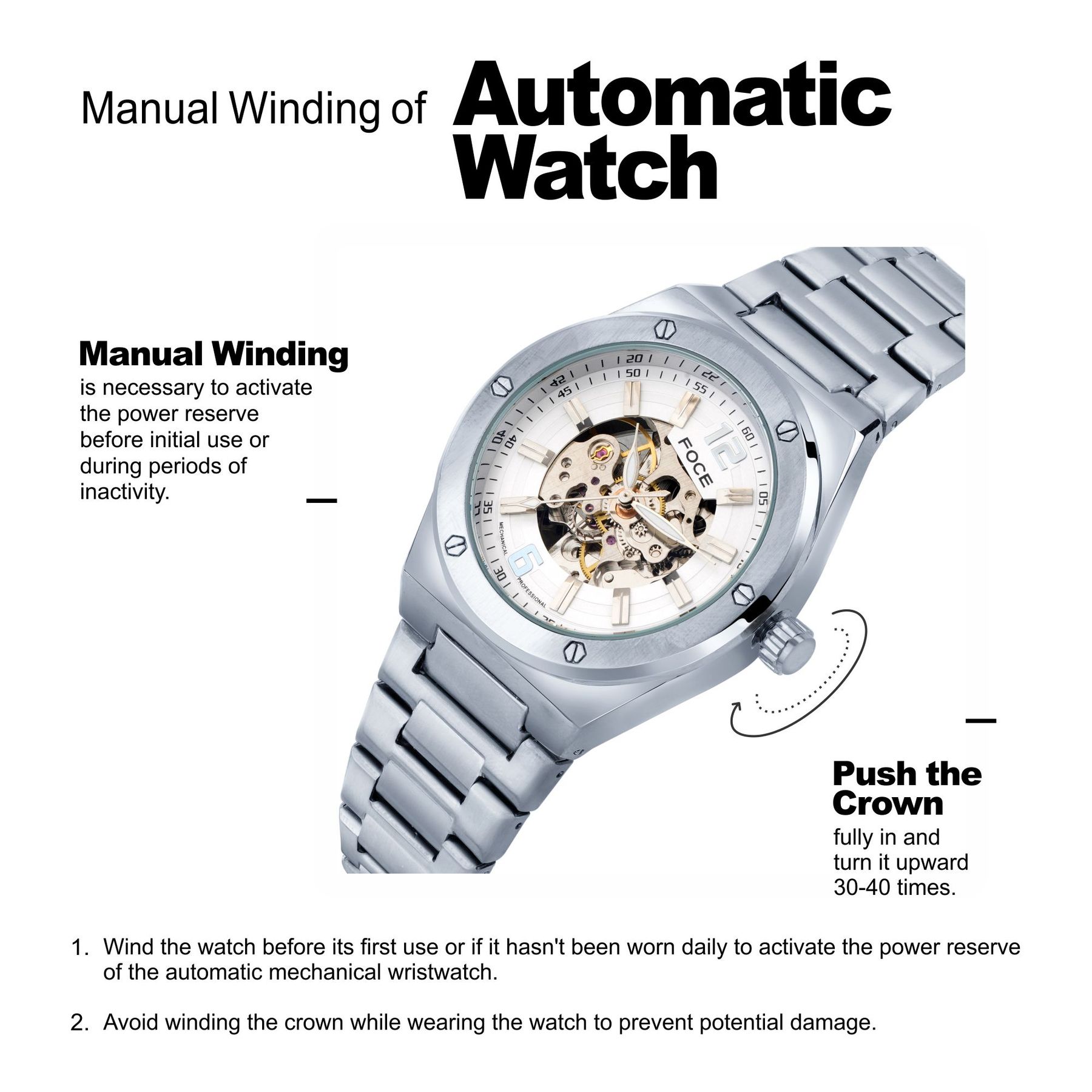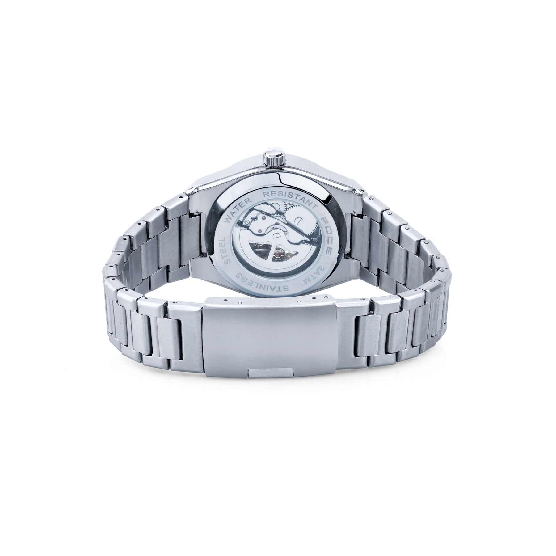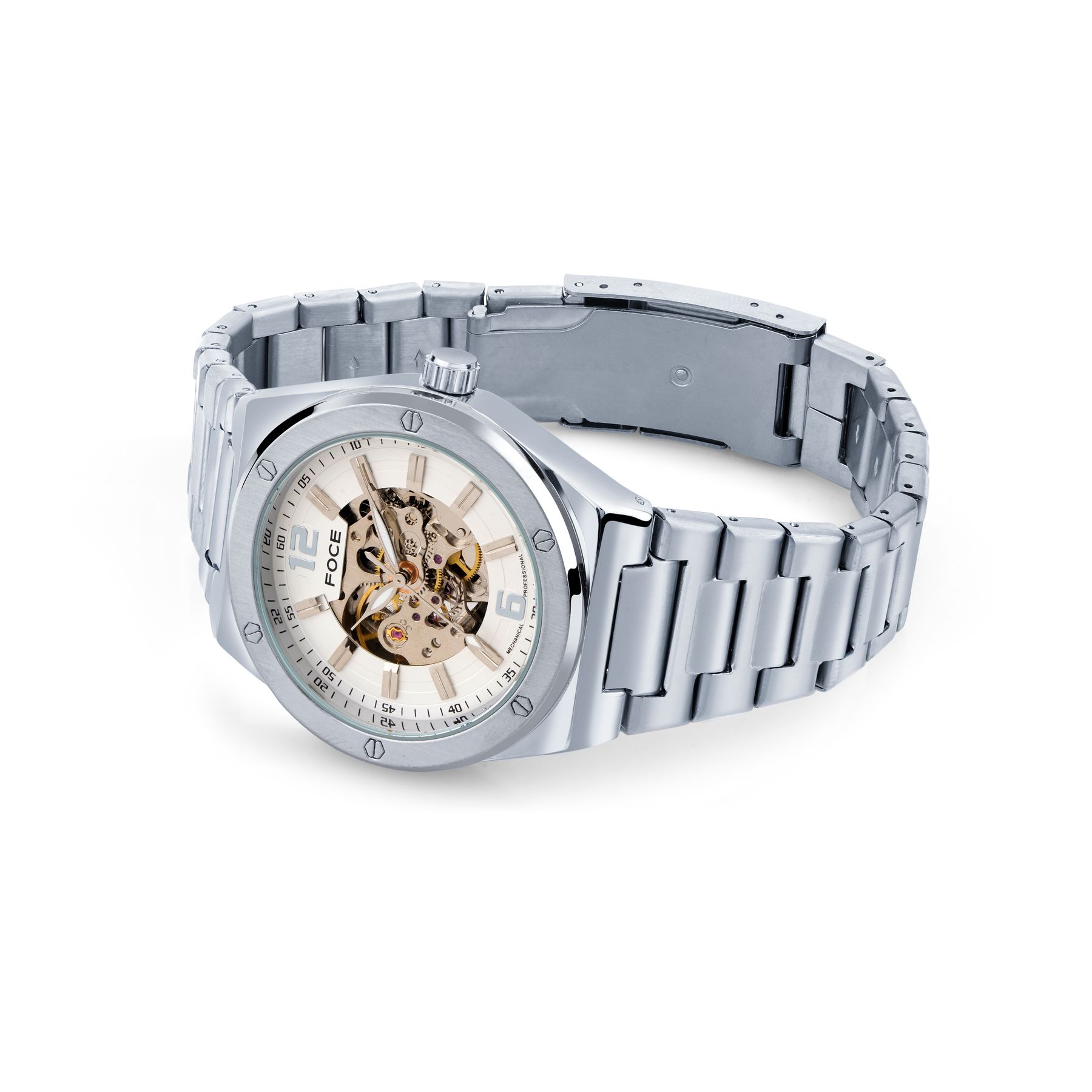 Discover timeless sophistication with FOCE’s Silver Automatic Wristwatch, featuring a self-winding skeleton movement—no battery required. Its striking white skeleton dial and transparent glass back showcase the intricate mechanics in motion, while the premium stainless steel case and strap ensure durability, comfort, and elegance. A bold fusion of luxury and precision, this versatile timepiece transitions seamlessly from business to casual occasions.