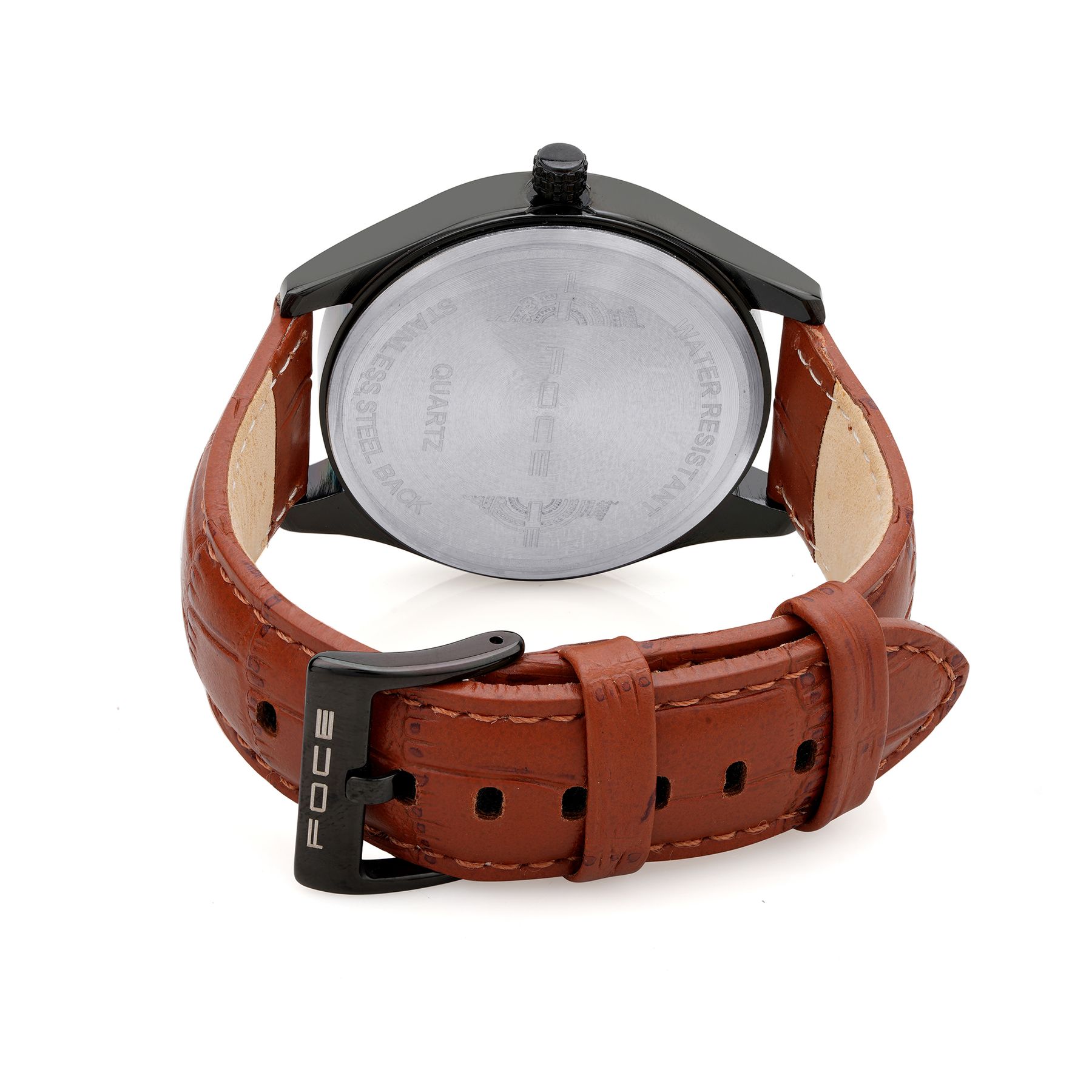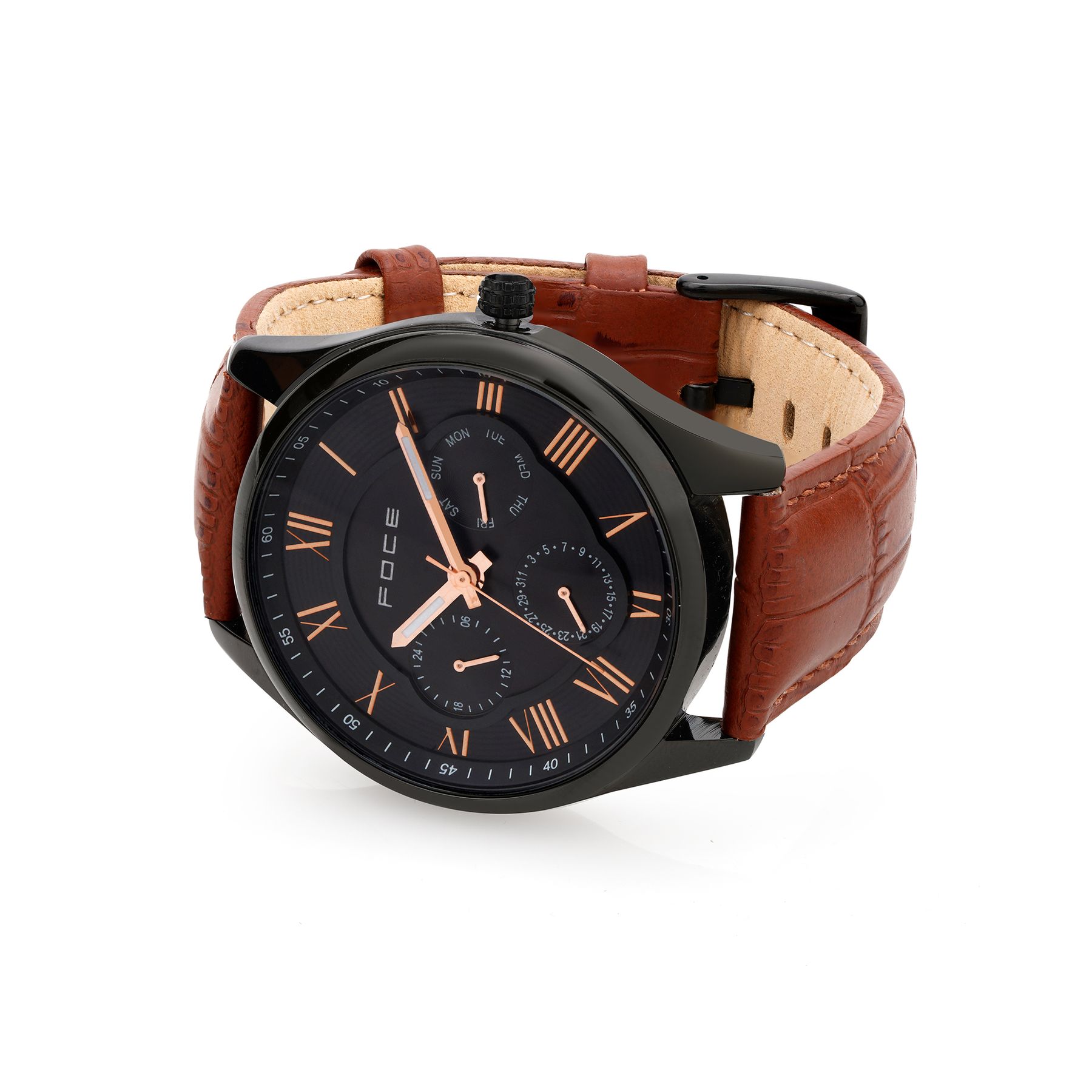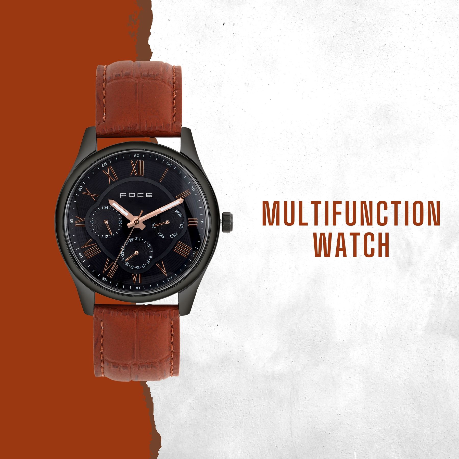 Make a lasting impression with the FOCE Men’s Black Multifunction Watch, showcasing a bold black dial, polished black case, and refined brown leather strap.