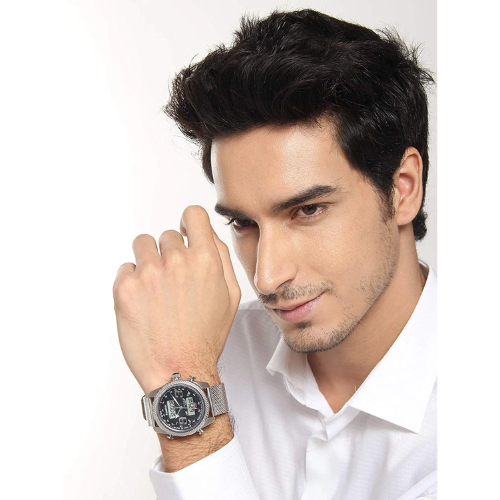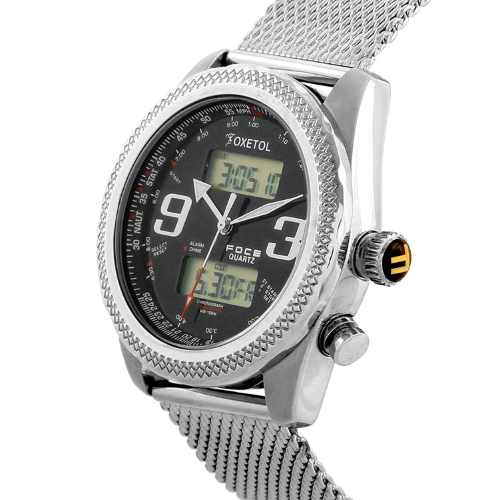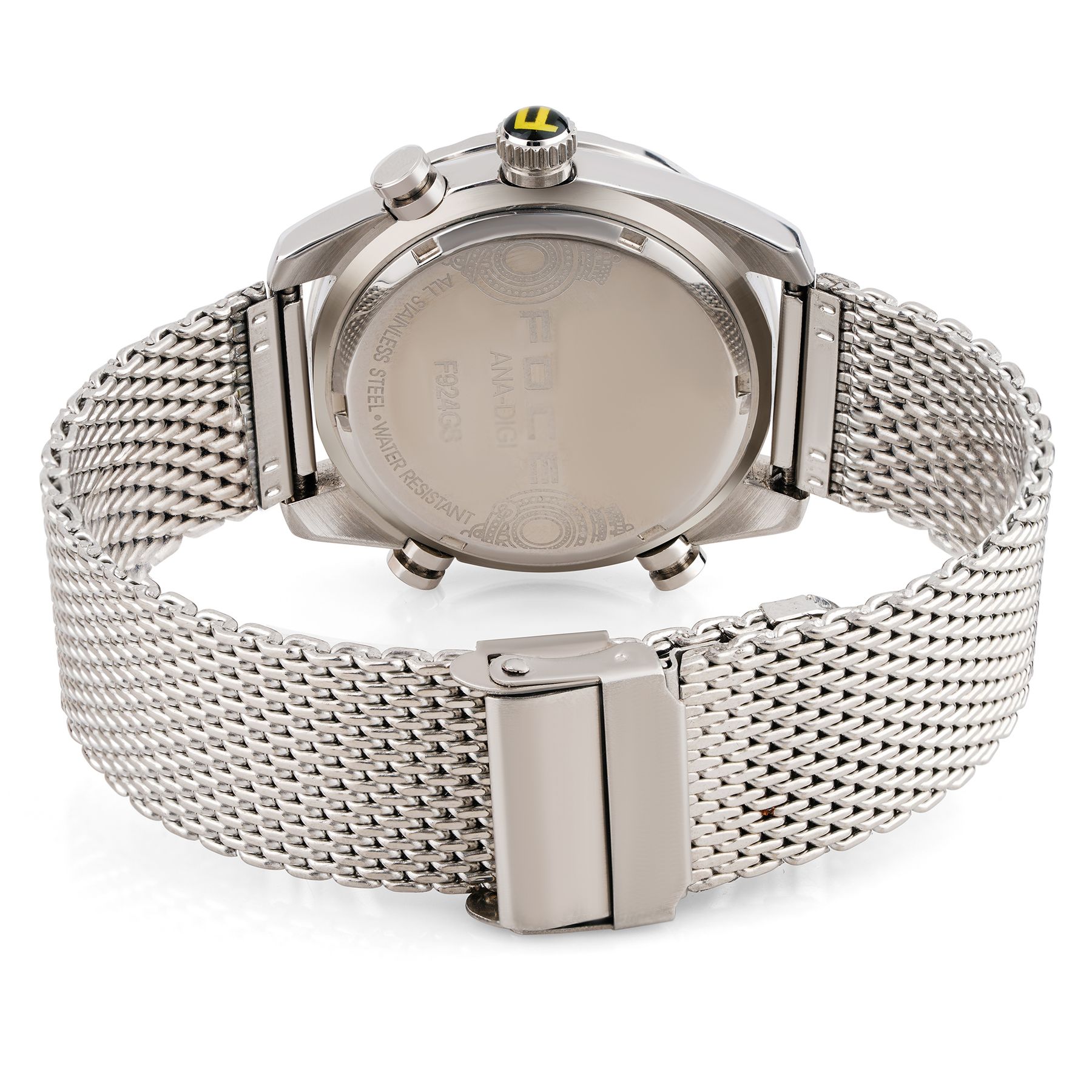 Experience the perfect blend of analog elegance and digital functionality with FOCE’s Ana-Digi Chronograph. Featuring a bold black dial, stainless steel case, and metal mesh strap, this versatile timepiece offers advanced chronograph features, dual time display, and enduring Korean craftsmanship for the modern man.