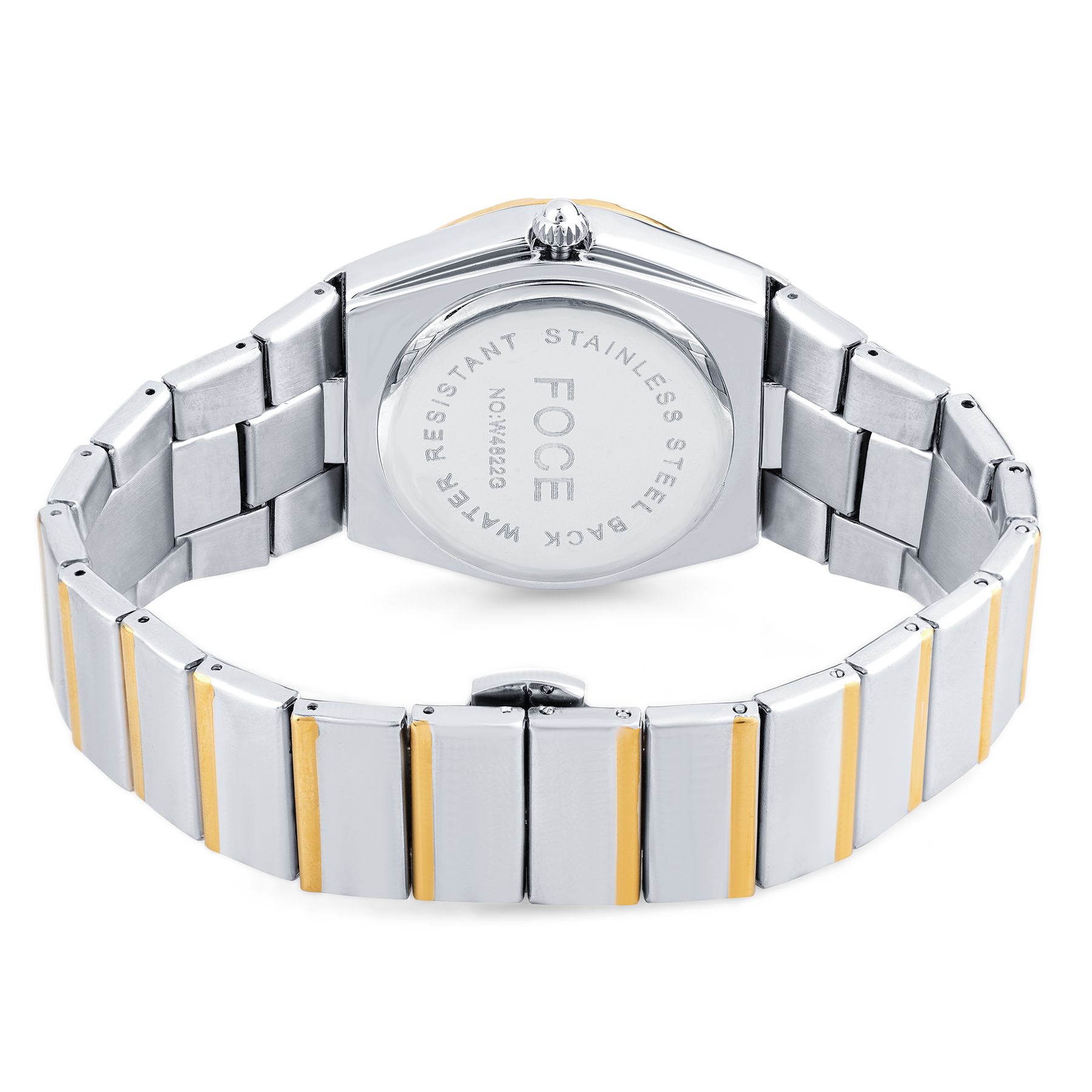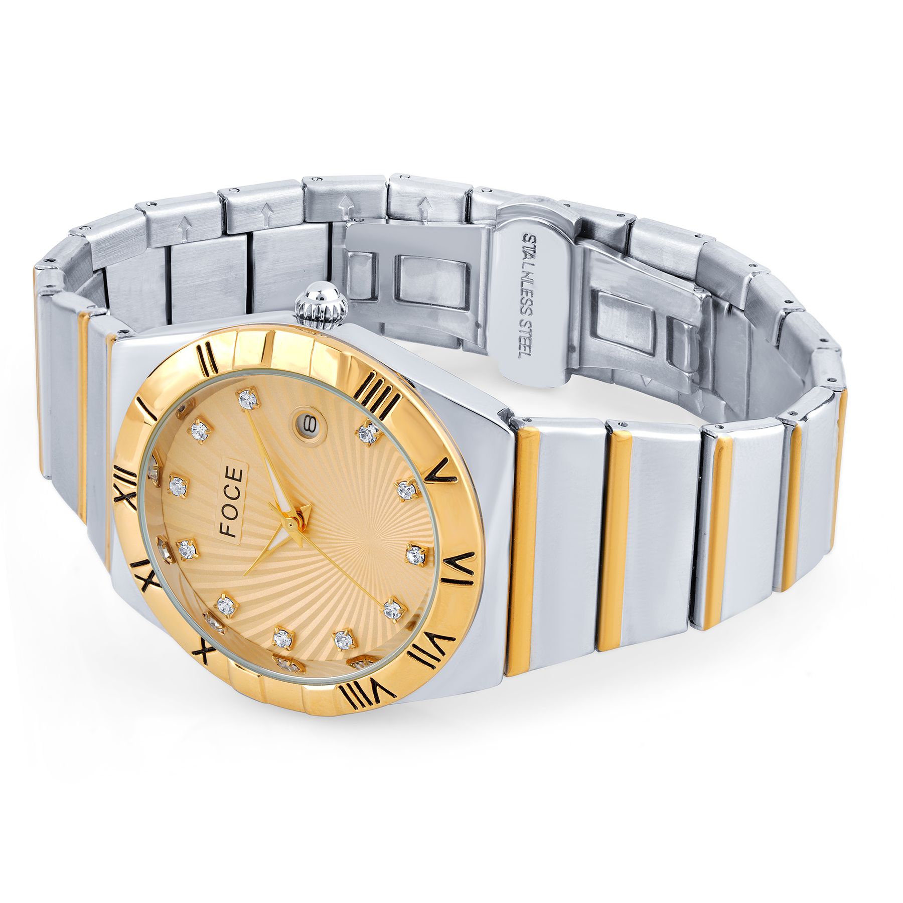 Exude sophistication with the FOCE Men’s Two Tone Silver/Golden Analog Watch, featuring a diamond-studded golden dial, Roman numeral bezel, and sleek stainless steel strap.
