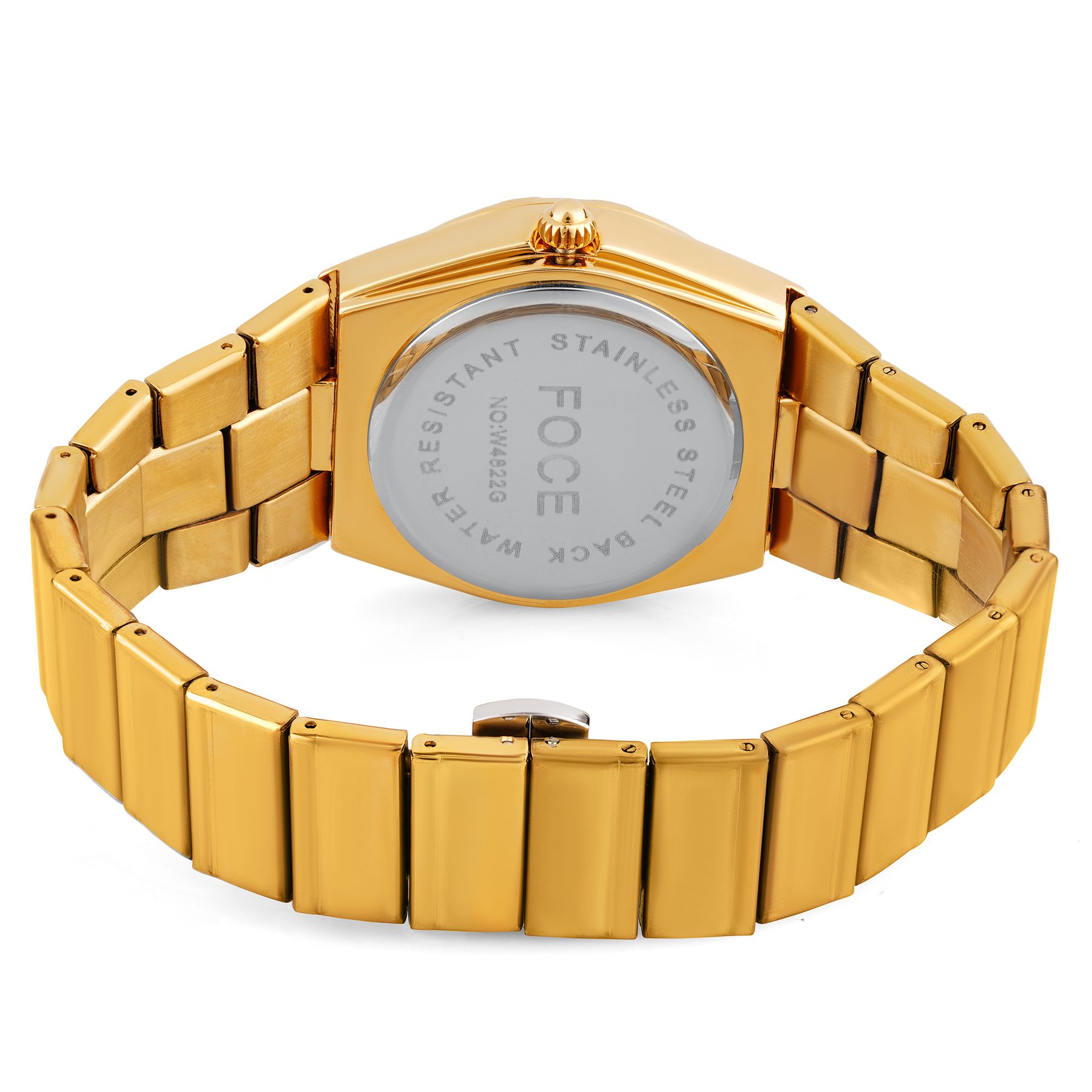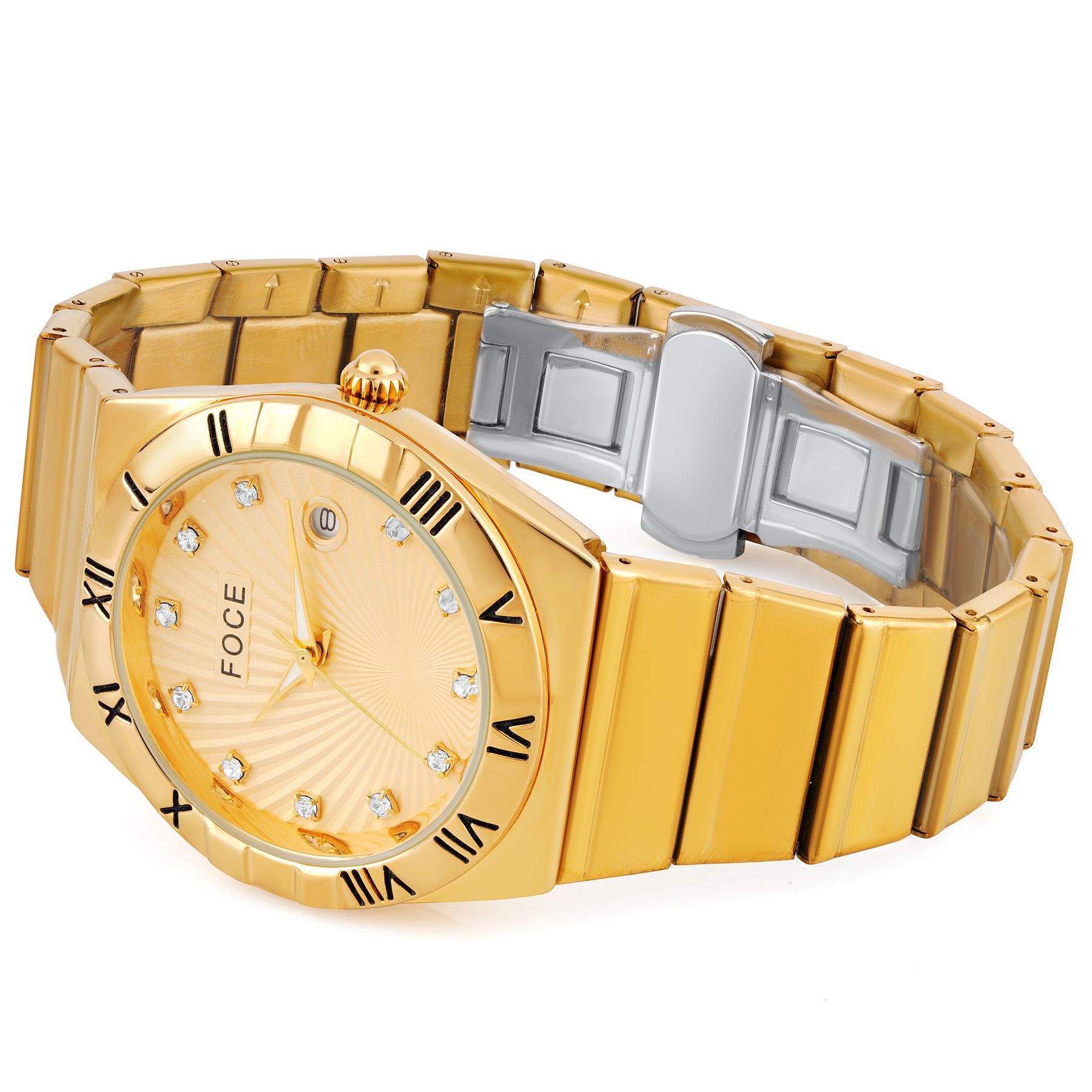 Exude sophistication with the FOCE Men’s Golden Analog Watch, featuring a diamond-studded golden dial, Roman numeral bezel, and sleek stainless steel strap.