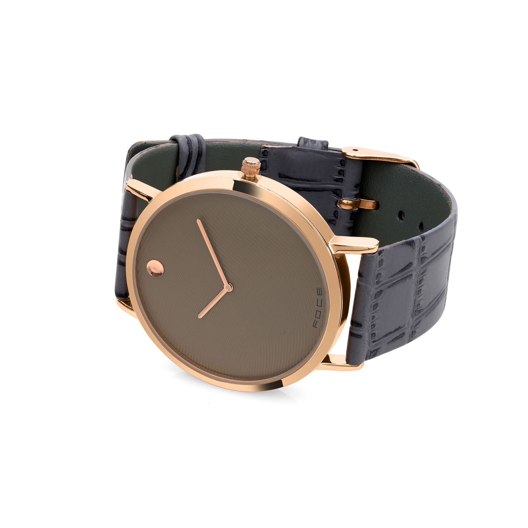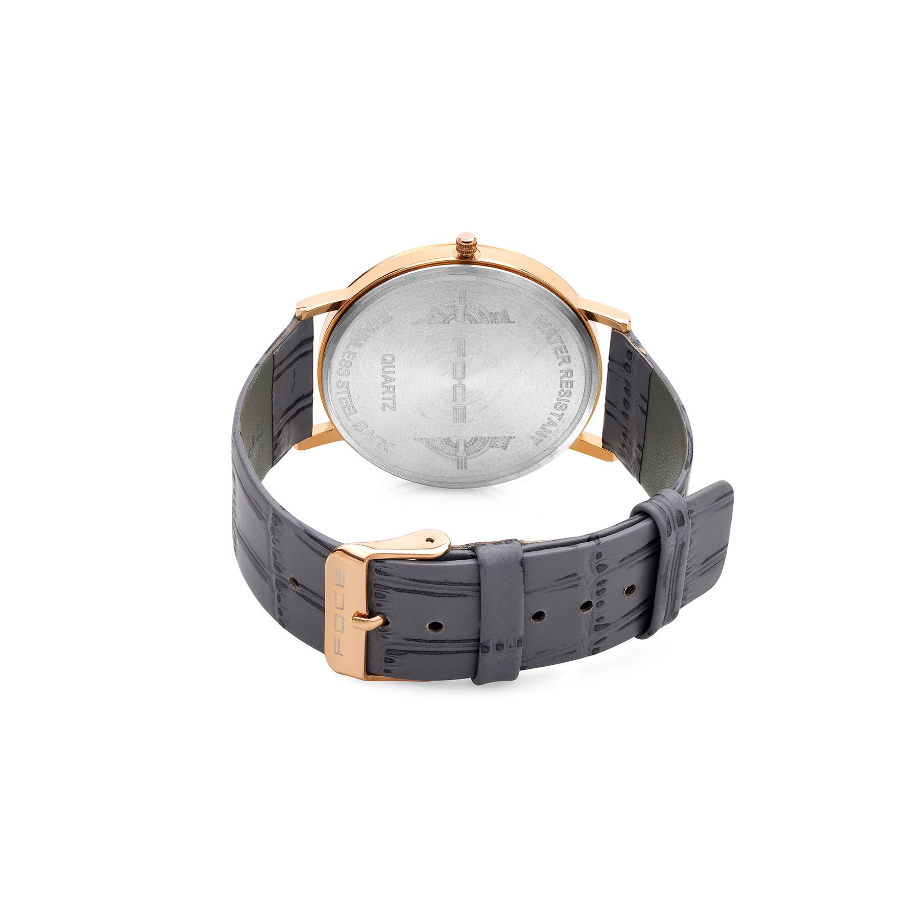 Elevate your look with the FOCE Men’s Rose Gold Slim Watch, featuring a sleek grey dial, rose-gold case, and matching grey leather strap.