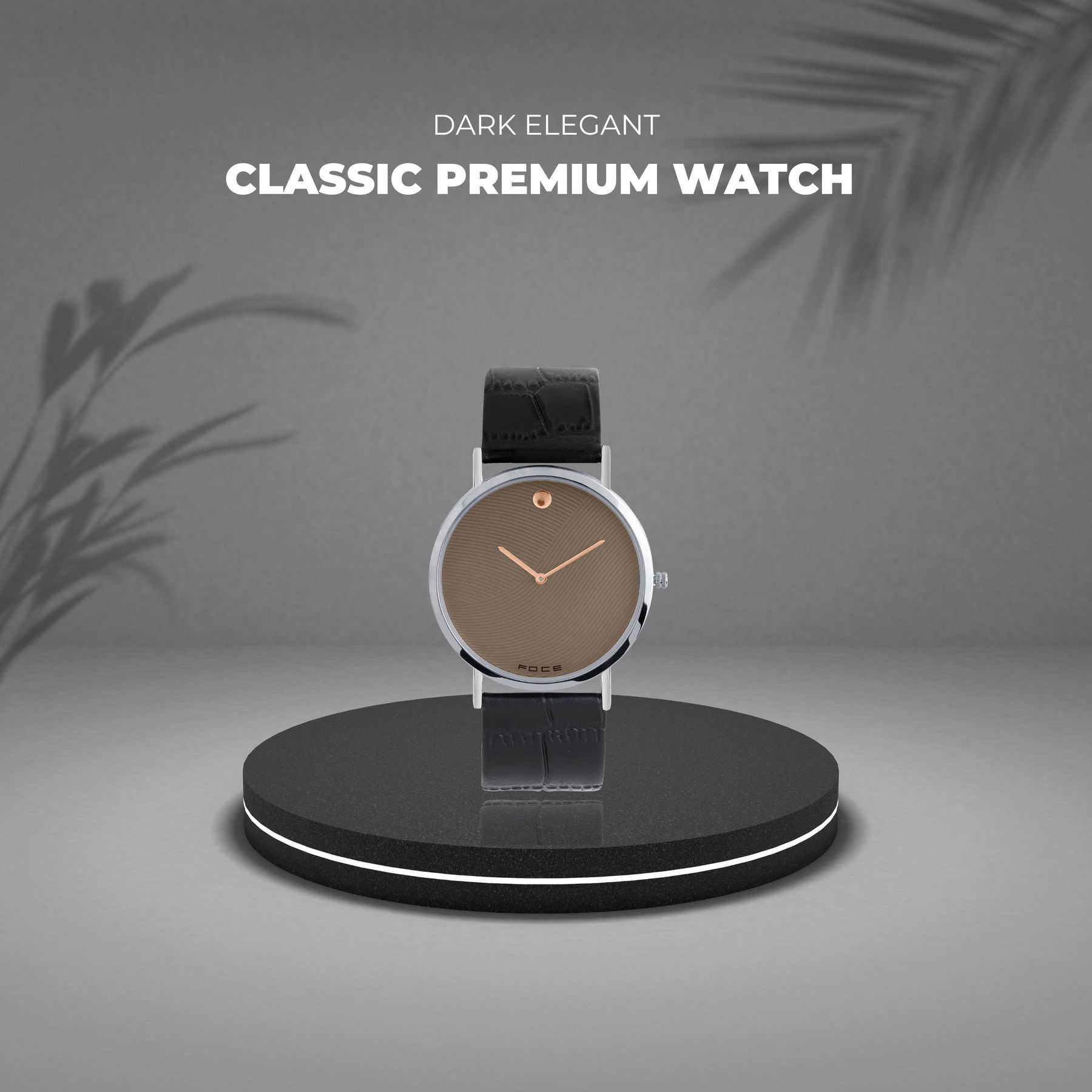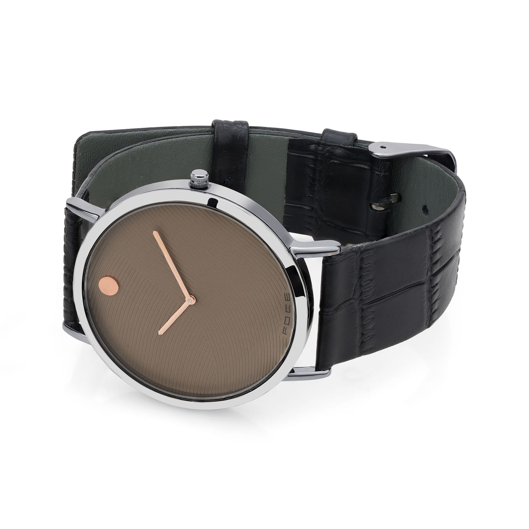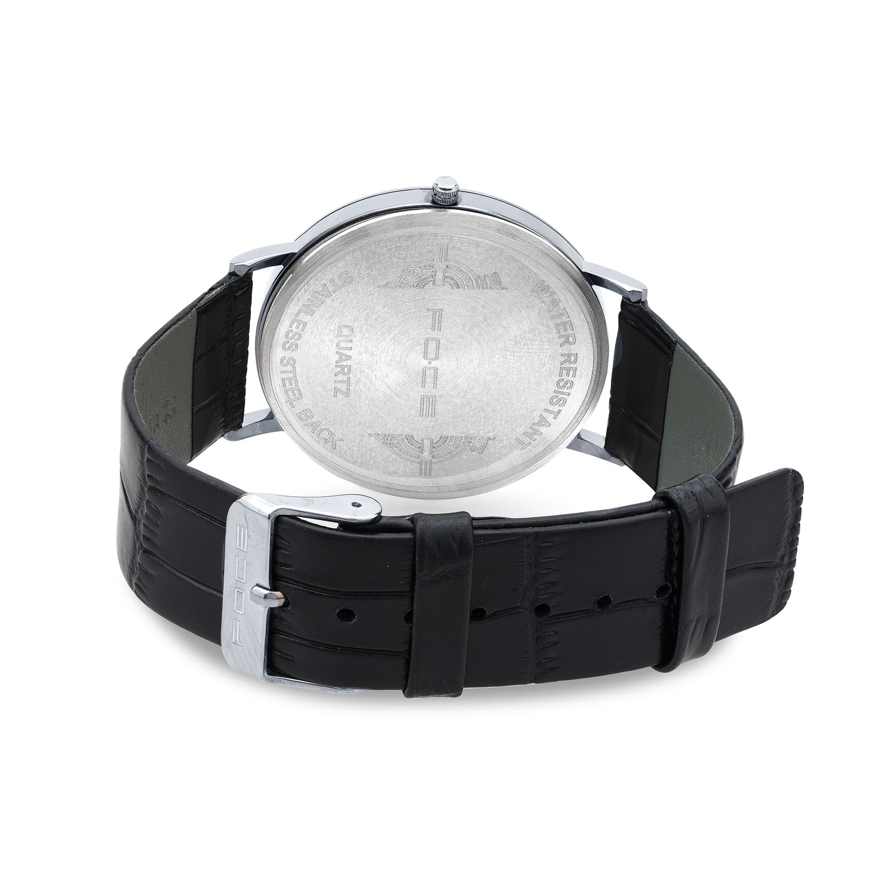 Sleek and sophisticated, the FOCE Men’s Silver Slim Watch features a bold black dial, polished silver case, and smooth black leather strap.