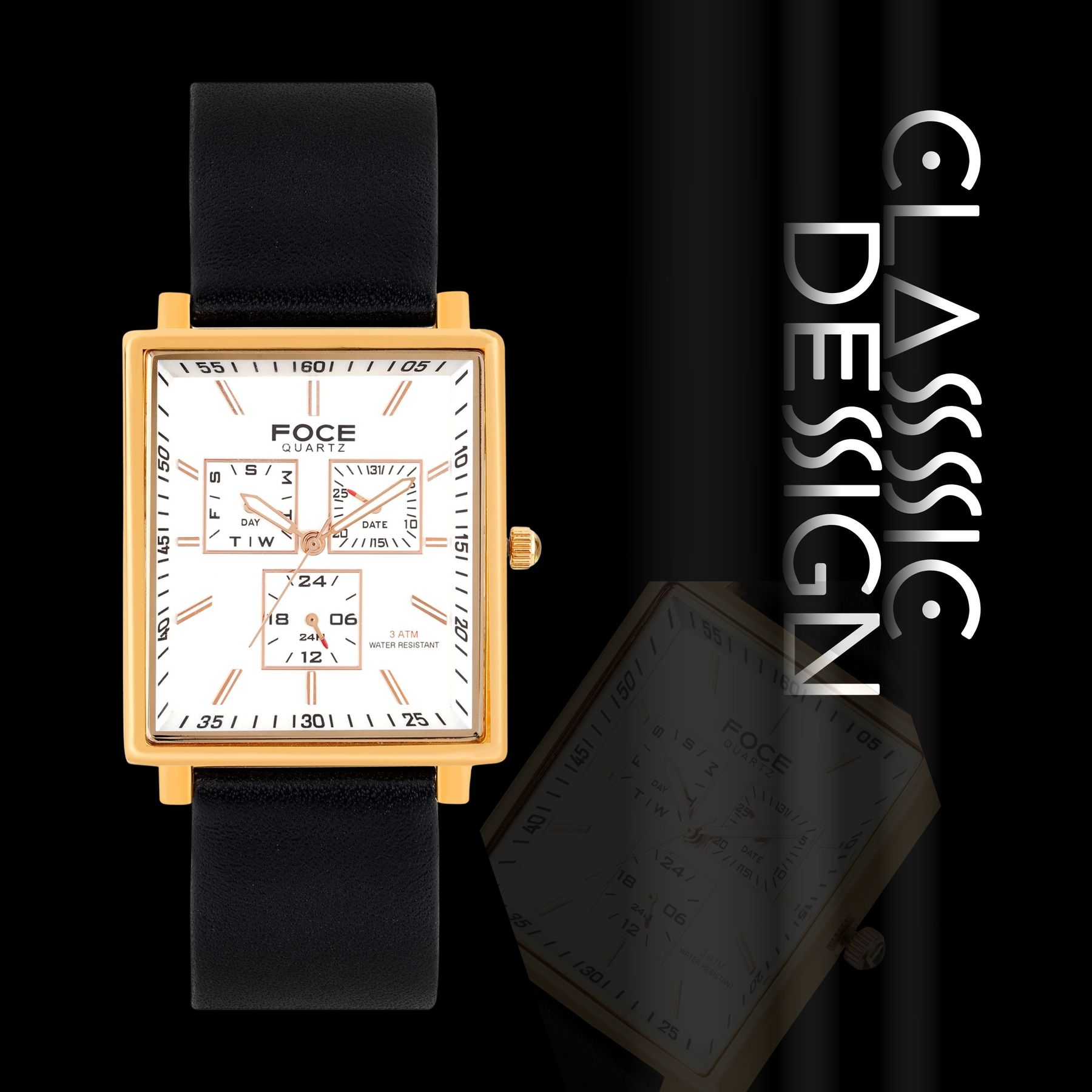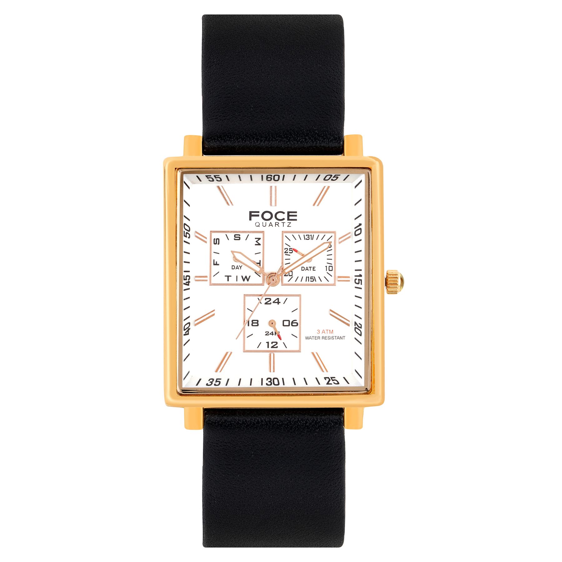 Elevate your style with FOCE’s rectangular white dial watch, featuring a golden case, genuine black leather strap, and multifunction day-date subdials. Perfectly blending modern sophistication with precise functionality, it’s designed for the discerning gentleman who values both elegance and performance.