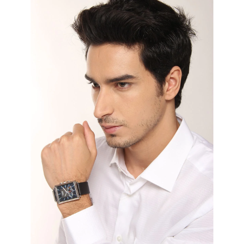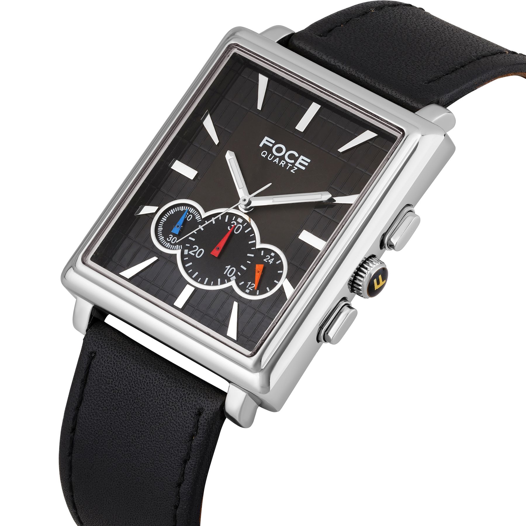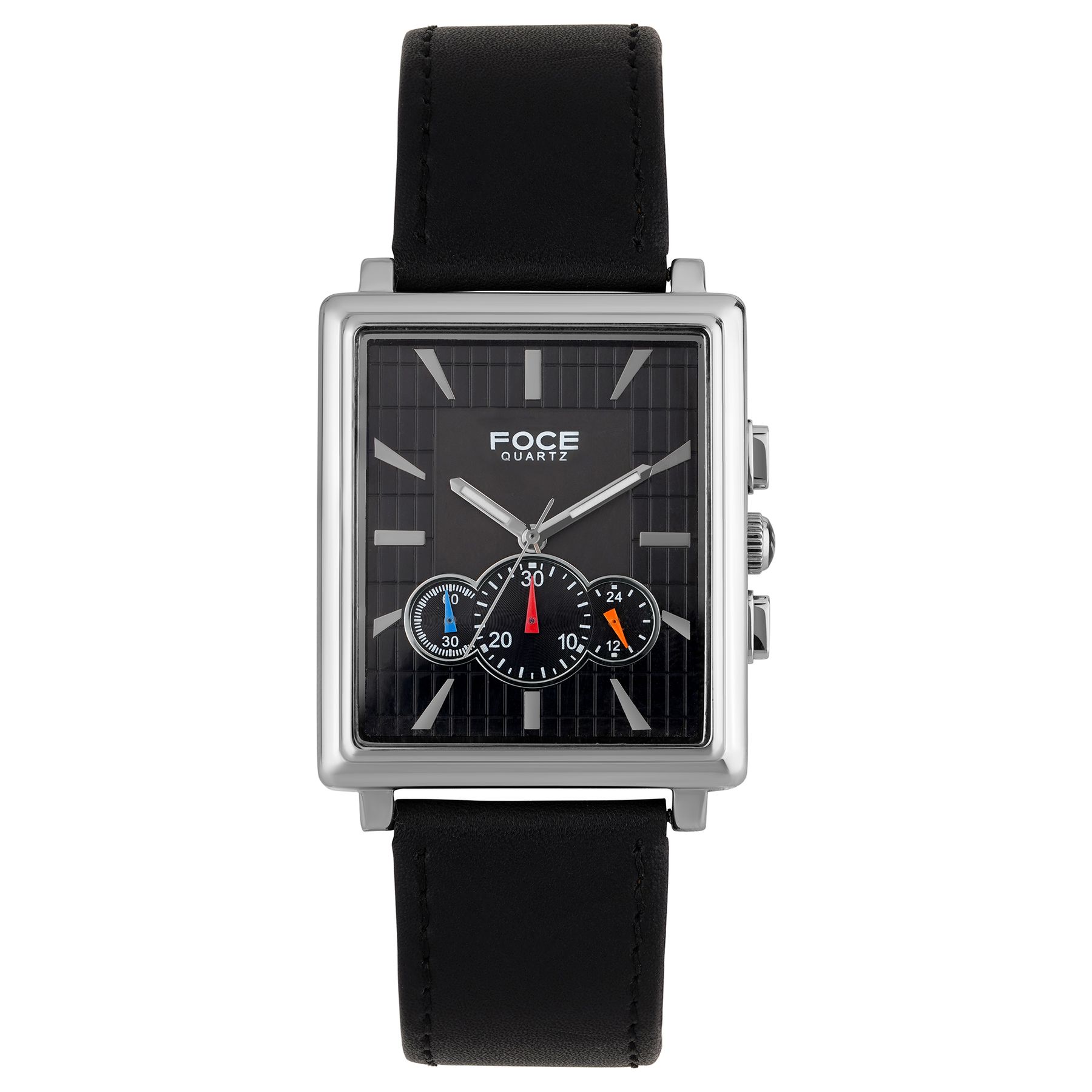 Elevate your style with FOCE’s rectangular white dial watch featuring a luxurious silver case, black leather strap, and multifunction day-date-24h subdials. Combining precision quartz movement with timeless design, it’s the perfect companion for the modern gentleman, seamlessly suited for both professional and casual settings.