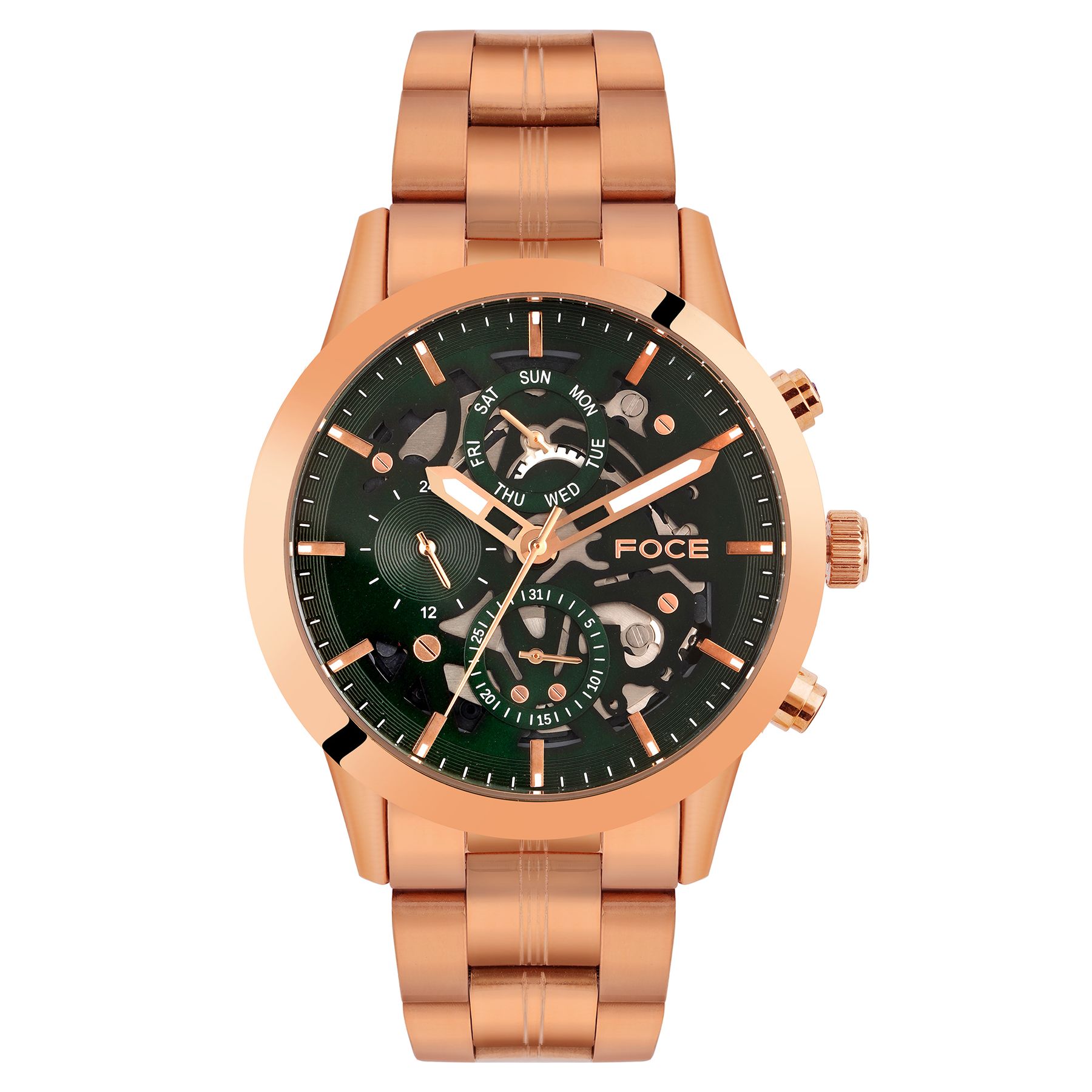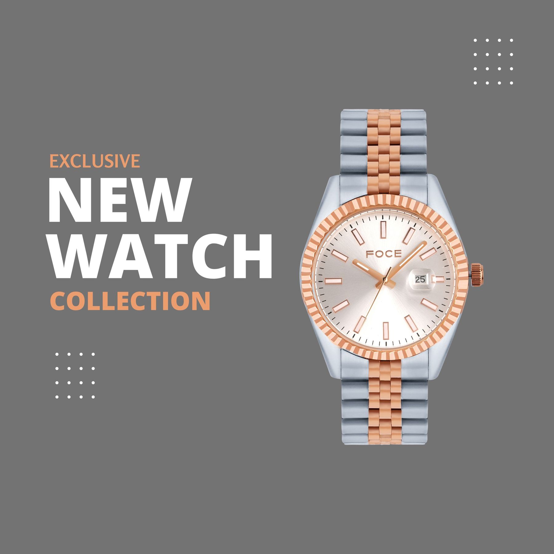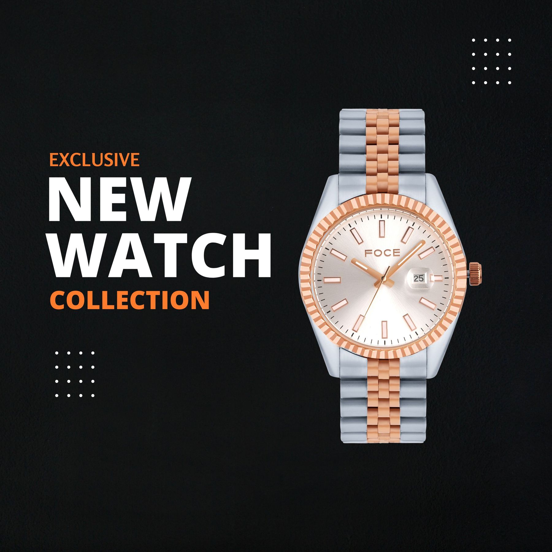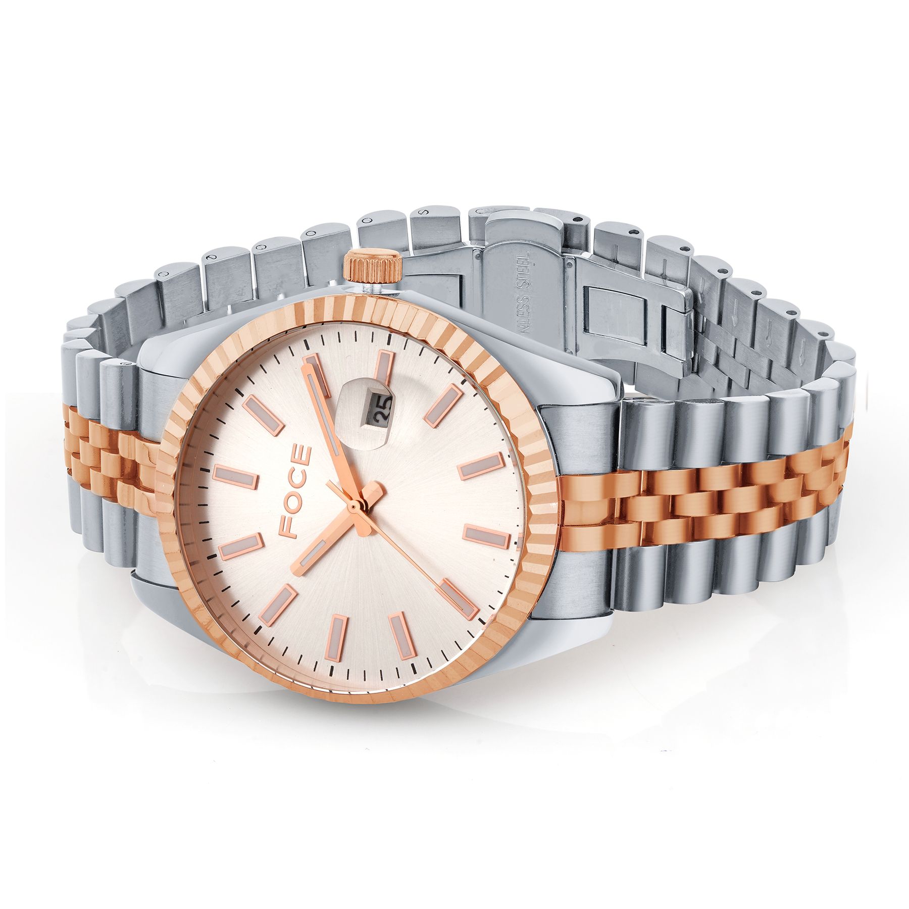 Experience timeless elegance with this FOCE premium timepiece, crafted in pure stainless steel and enriched with bold two tone silver & rose gold plating.