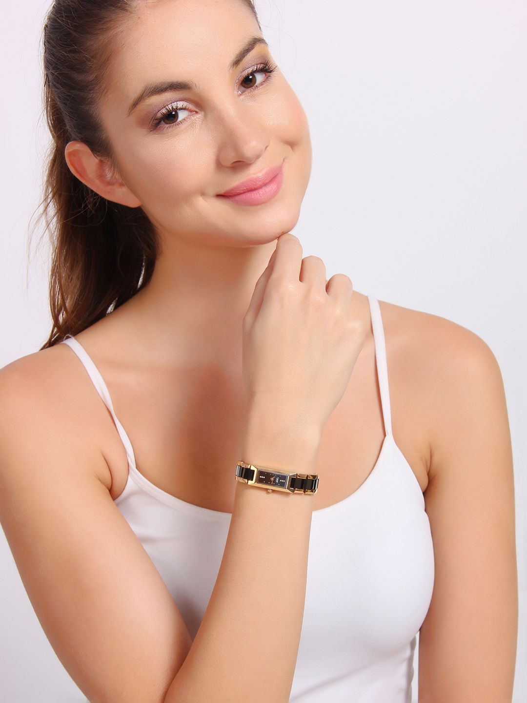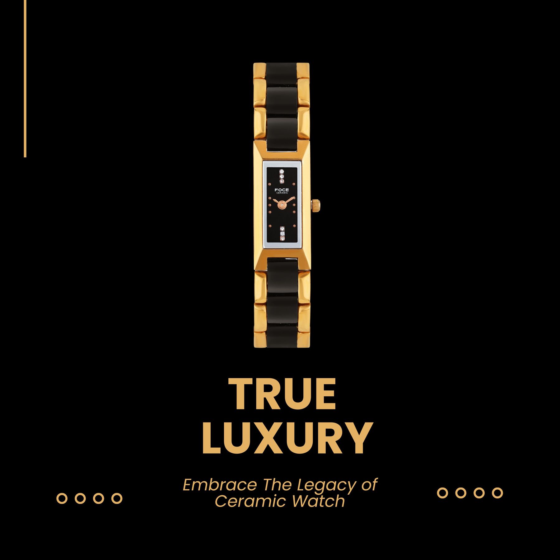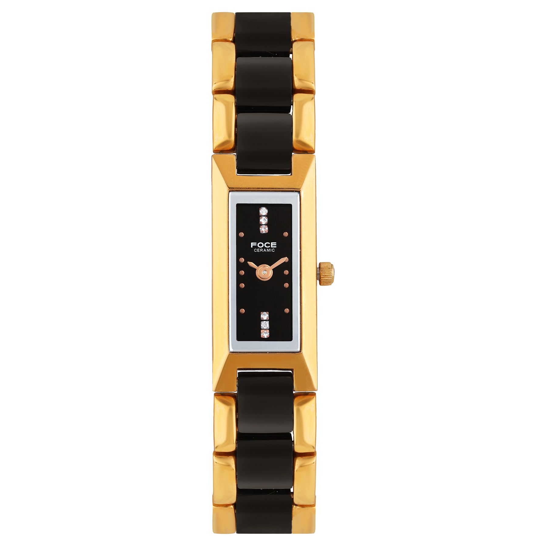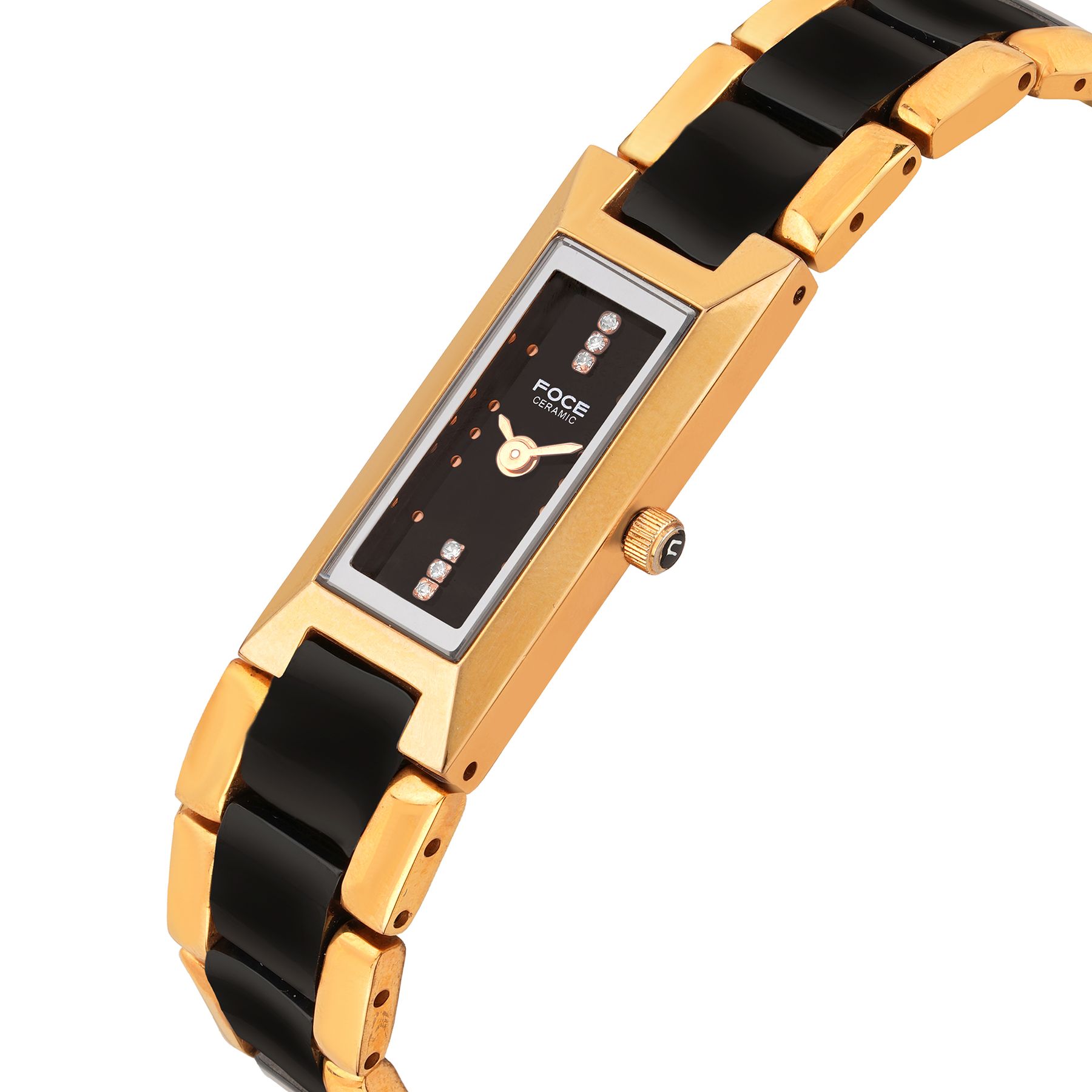 Embrace timeless sophistication with FOCE’s ultra-thin rectangular women’s watch, featuring a lustrous golden case, black dial, and dual-tone ceramic and stainless steel strap.