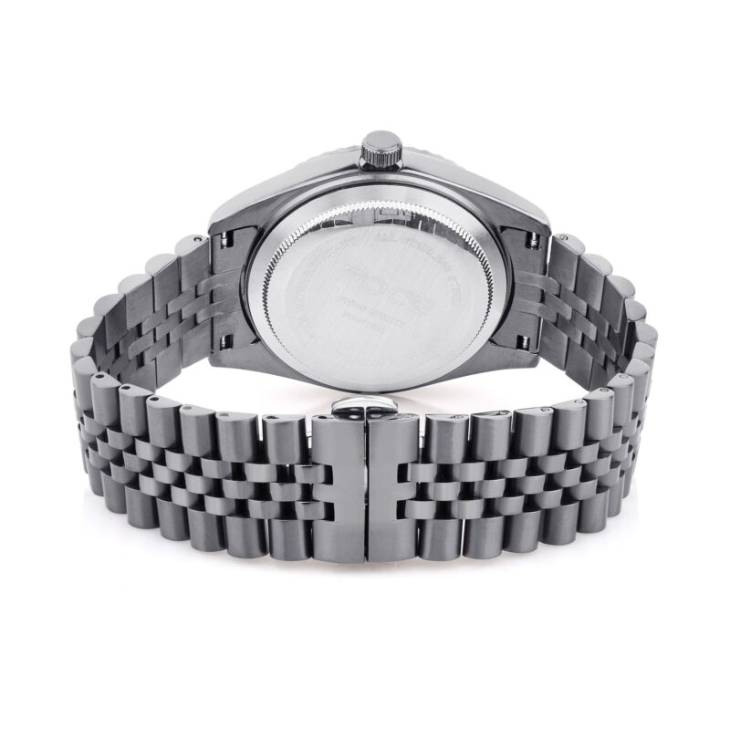 A deep glossy grey dial with date display merges functionality and finesse for the modern gentleman.