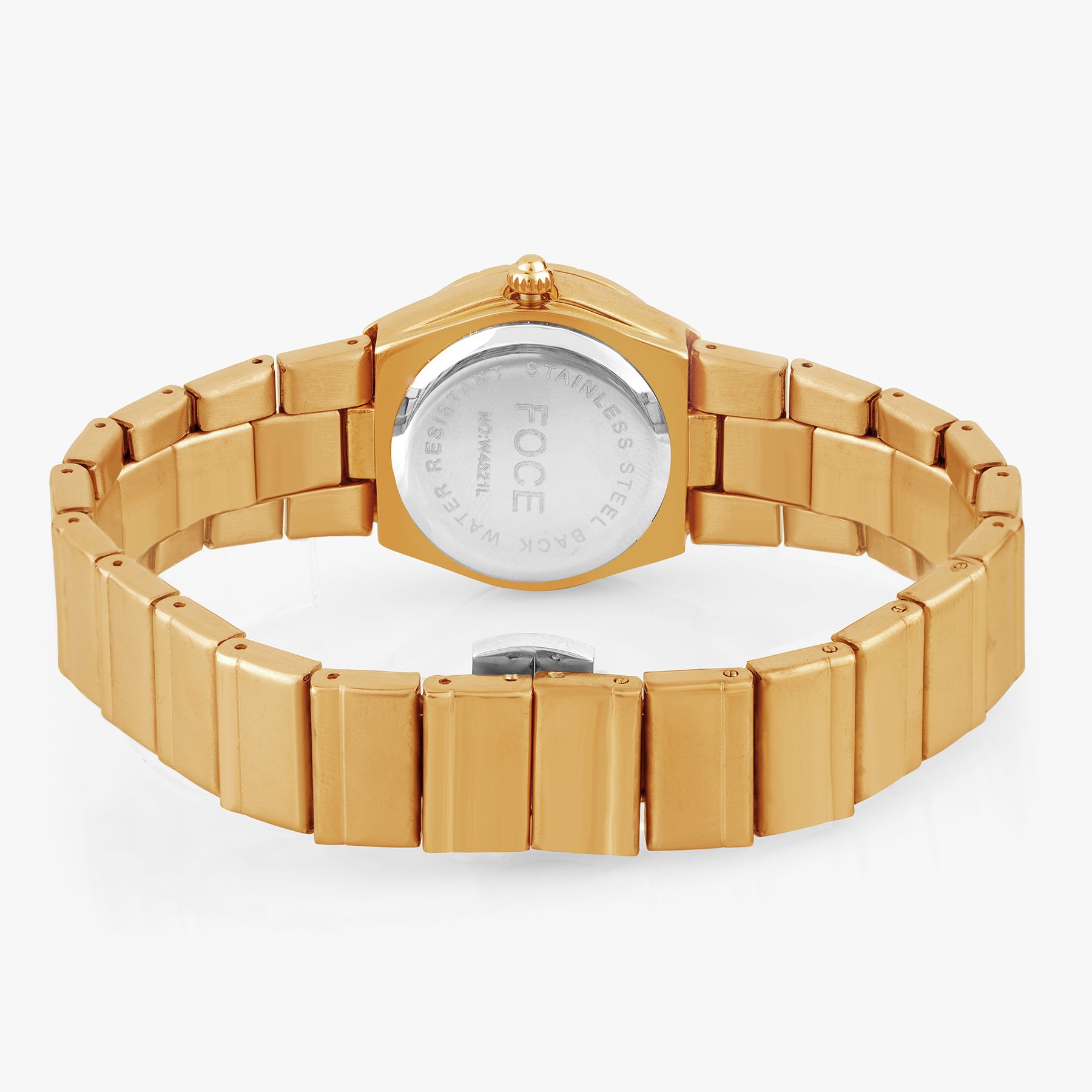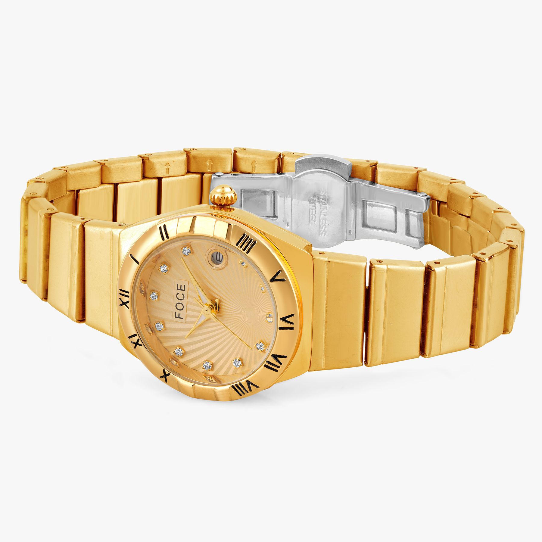 Radiate elegance with the FOCE Women’s Golden Analog Watch, showcasing a diamond-studded golden dial, Roman numeral bezel, and a graceful golden stainless steel strap.
