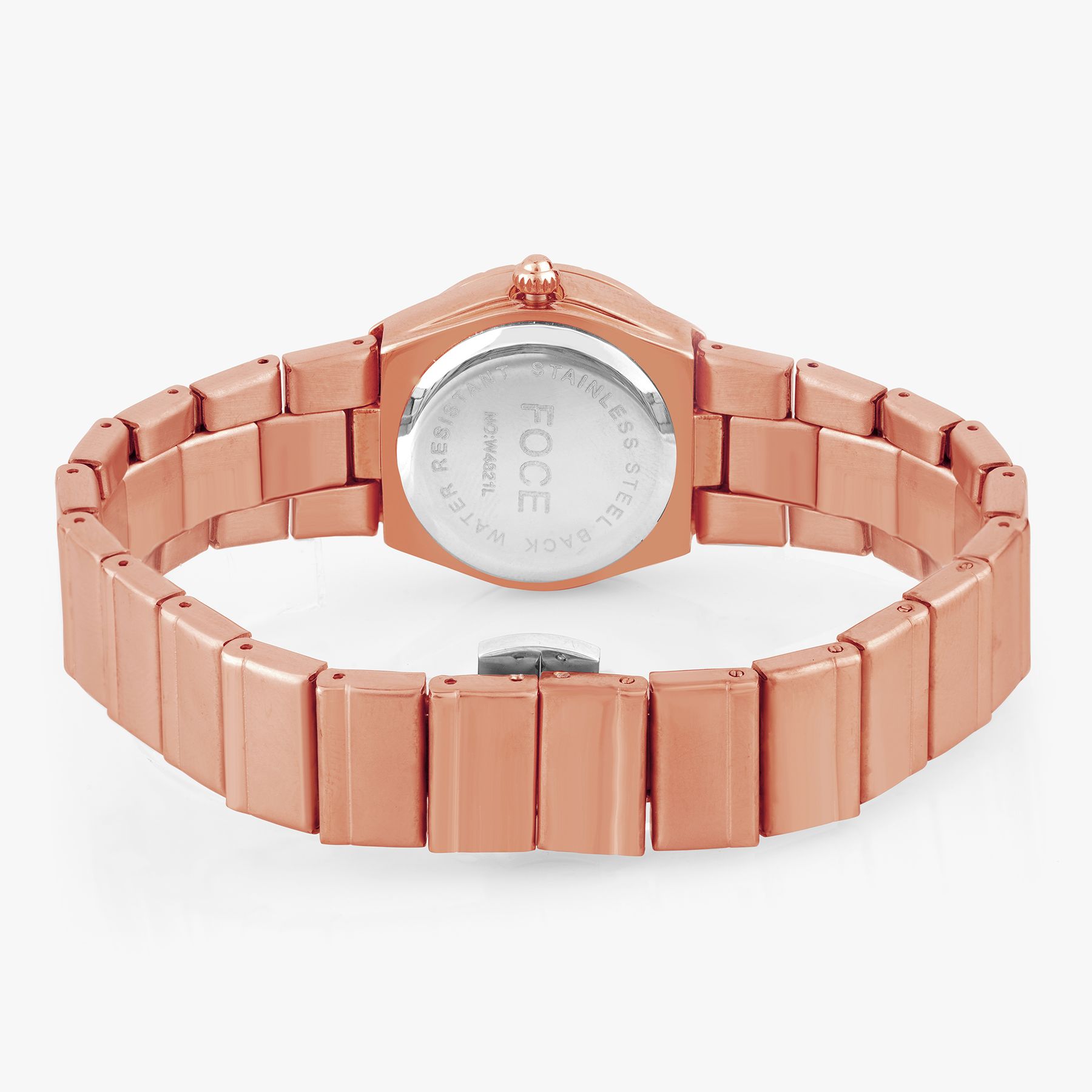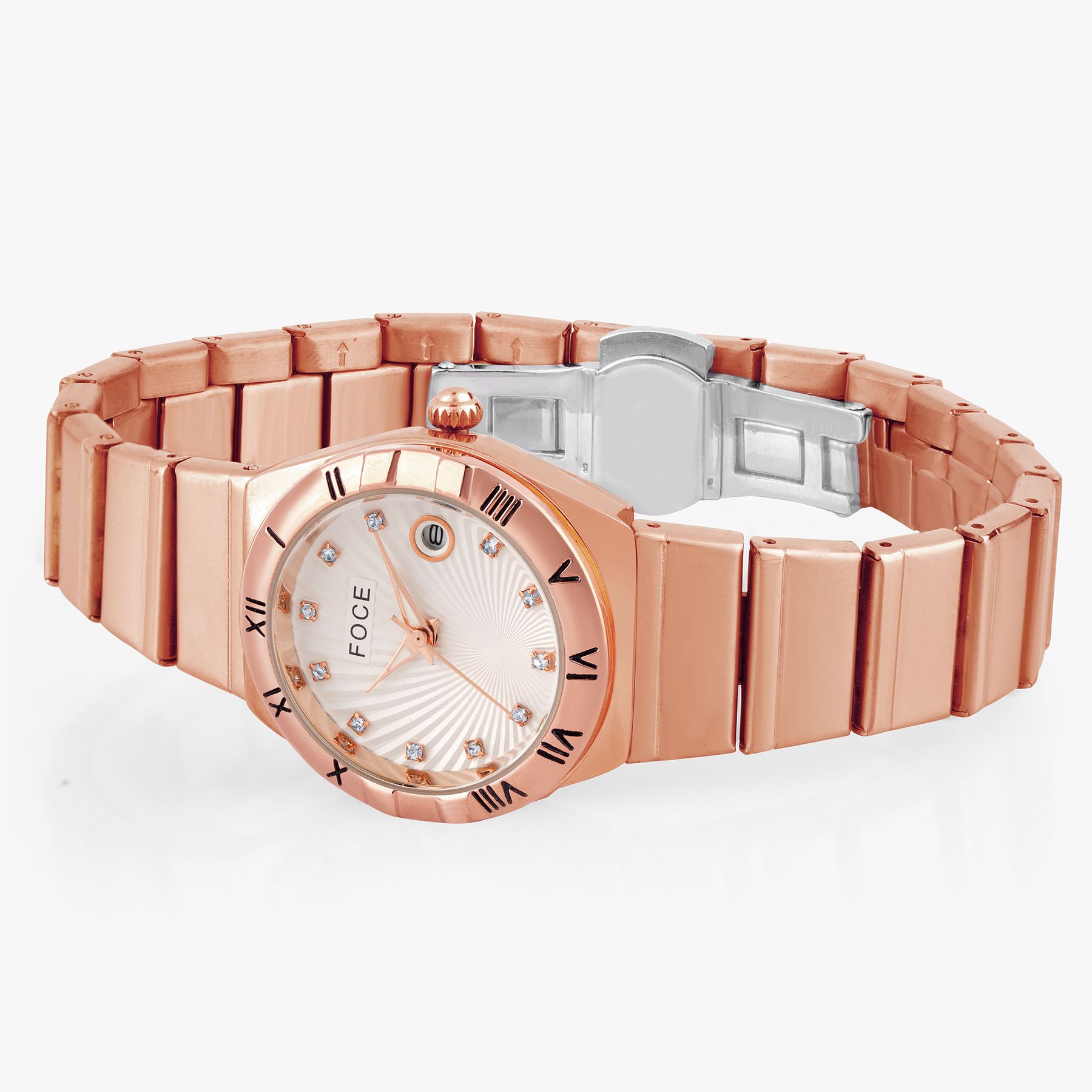 Radiate elegance with the FOCE Women’s Rose Gold Analog Watch, showcasing a diamond-studded white dial, Roman numeral bezel, and a graceful golden stainless steel strap.